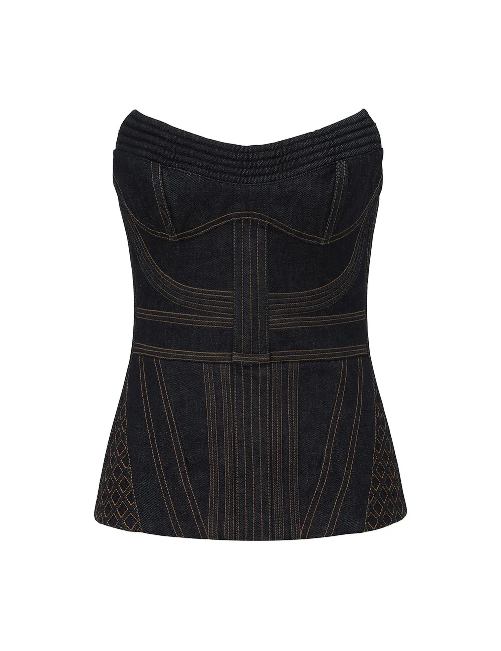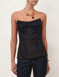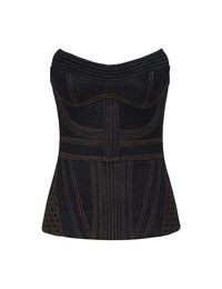 ITEM DETAILS The Corded Denim Corset in Night Sky from our Cruise 2026 Collection, Twisted Romance. A denim corset featuring a strapless V-neckline, topstitching throughout and a centre back zip closure. - Denim corset - Boning encased bust - Corded bodice - Shirred centre back with gold metal zip closure - Quilted detailing - Topstitching throughout Style Code: 7255TC261 SIZE DETAILS 0P 0 1 2 3 4 Length 31 34 34 34 34 34 Bust 68 72 76 82 88 92 Waist 64 66 72 76 82 86 Designed to be fitted on the body Heavy-weight, non-stretchy fabric This garment fits true to size Available in size 0P, suited to clients who are under 5'3"/ 160cm Model is 5'9.5"/178 cm, bust size 32C/10C and wears a size 0 Item measurements have been rounded to the nearest cm CARE INSTRUCTIONS Main: 75% cotton, 25% viscose; lining: 86% polyester, 14% cotton Dry clean only code f (hydrocarbon only); Remove any detachable trims prior to dry cleaning; Cover to protect trim; Do not steam; Iron in low temperature with protective cloth; Do not spot clean Always check the label or care card for specific care instructions.