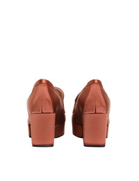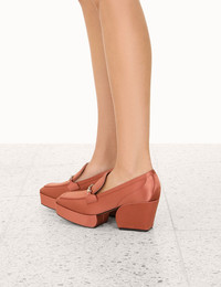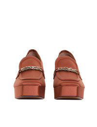 ITEM DETAILS The Crescent Satin Loafer in Rust from our Fall 2022 Collection, Stargazer. A satin loafer featuring custom plated gold chain detail. - Satin loafer - Made in Italy - 75mm heel - 30mm platform Style Code: 4124F22 STYLING Style the Crescent Satin Loafer with a blouson sleeve blouse and high waisted denim for a sophisticated look SIZE DETAILS This shoe fits true to size, we recommend you select your normal size. Heel height: 75mm Platform height: 30mm CARE INSTRUCTIONS 72% viscose, 28% silk raso stretch upper 100% calf leather lining 100% calf leather outsole Exclusive of trims. This item was handcrafted using genuine leather. Leather can alter or stain if in contact with humidity or atmospheric agents. These are naturally occurring features and should not be thought of as imperfections. On occasion leather can stain clothing or other objects it comes into contact with. To maintain in best condition, avoid direct exposure to light and heat, water, oils, perfume and cosmetics and store at room temperature. Always check the garment care label for specific care instructions