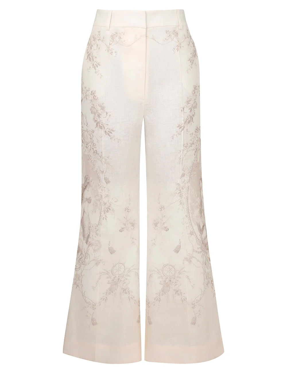 ITEM DETAILS The Cropped Flare Pant in Mermaid Toile from our Cruise 2026 Collection, Twisted Romance. A linen flare pant featuring a fixed waistband with belt loops, centre front zip closure, finished with a cropped wide hem. - Linen fabric - Flare silhouette - Invisible zip closure at centre front - Slant side seam pockets - Back welt pockets - Placement print Style Code: 4068PC26R SIZE DETAILS 0P 0 1 2 3 4 Length 35.5 37 37 37.5 38 38 Waist 27.5 28.5 30.5 33 34.5 37 Hip 35.5 38 39.5 41.5 43.5 45.5 Inseam 25 27 27 27 27 27 Fitted at the waist and hips, relaxed through the legs High-rise waist with a cropped leg This garment fits true to size Available in size 0P, suited to clients who are under 5'3"/ 160cm Model is 5'9.5"/178 cm, bust size 32C/10C and wears a size 0 Item measurements are in inches CARE INSTRUCTIONS Main: 100% linen; pocketing: 100% cotton Dry clean only code f (hydrocarbon only); Remove any detachable trims prior to dry cleaning; Cover to protect trim; Iron in low temperature with protective cloth; Light steam only; Do not spot clean Always check the label or care card for specific care instructions.