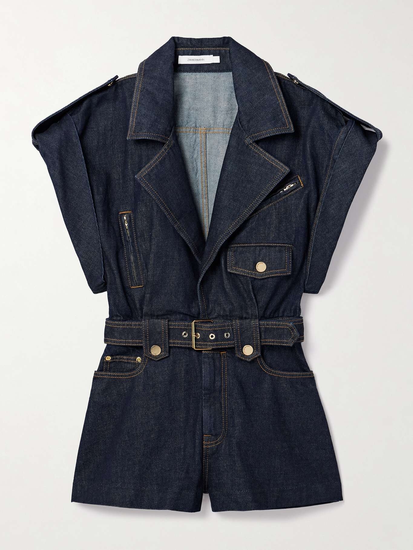 EDITORS'NOTES Zimmermann's 'Crush' playsuit comes in an inky 'Night Sky' wash that appears throughout the Resort '25 collection. Made from sturdy denim, it has wide lapels and shoulders, which are detailed with buttoned epaulettes. Notch the matching belt to a comfortable fit. SIZE & FIT - 00 = UK 6/ US 2/ FR 34 - 0 = UK 8/ US 4/ FR 36 - 1 = UK 10/ US 6/ FR 38 - 2 = UK 12/ US 8/ FR 40 - 3 = UK 14/ US 10/ FR 42 - 4 = UK 16/ US 12/ FR 44 - Fits true to size, take your normal size - Intended for a slightly loose fit, use the belt to cinch in at the waist - Mid-weight, non-stretchy denim - Model is 177cm/ 5'10" and is wearing the designer's size 0 - Bust: 82cm/ 32.5" - Waist: 64cm/ 25" - Hip: 88cm/ 34.5" DETAILS & CARE - Dark-blue denim - Button and concealed zip fastening at front - 75% cotton, 25% viscose - Designer wash: Night Sky