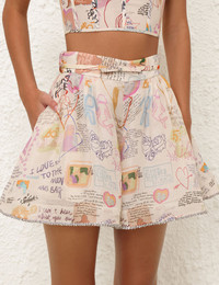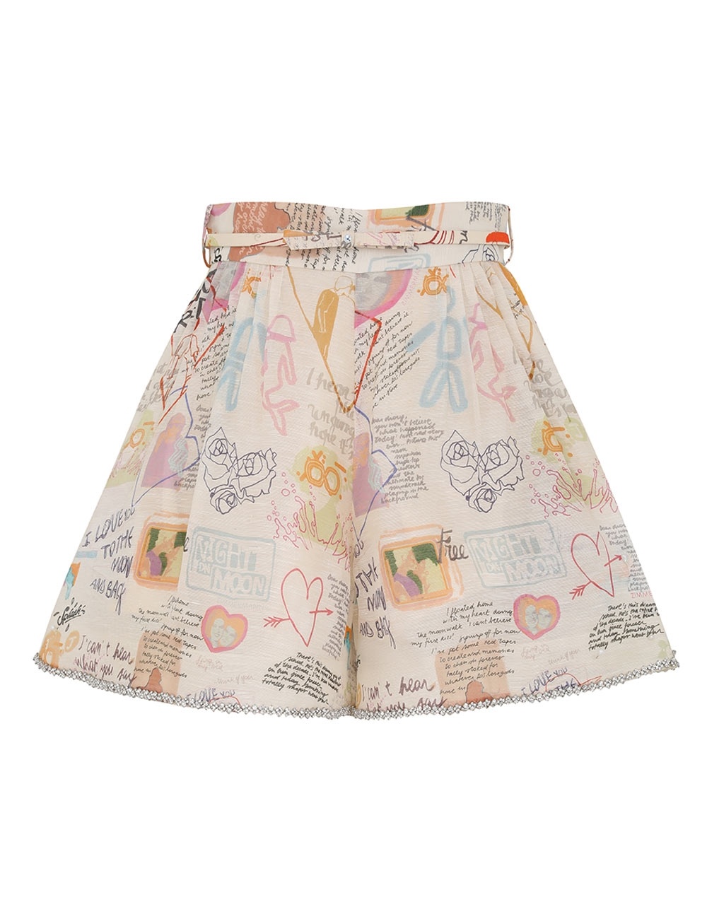 ITEM DETAILS The Crush Belted Tuck Skort in Dear Diary from our Resort 2025 Collection, Crush. A high waisted silk linen skort featuring side seam pockets, a centre back invisible zip closure, a removable belt and crystal trim on the hemline. - Silk linen skort - Removable belt - Placement print throughout - Invisible zip at centre back - Deep tucks at the front - Lined Runway: This style was featured on the R25 Runway. Style Code: 2774AR251 SIZE DETAILS 0P 0 1 2 3 Length 34 35 36 37 37 Waist 66 69 74 79 84 Fitted high waist This garment fits true to size Available in size 0P, suited to clients who are under 5'3"/ 160cm Model is 5'9.5"/178 cm, bust size 32C/10C and wears a size 0 Item measurements have been rounded to the nearest cm CARE INSTRUCTIONS Main: 55% linen, 45% silk, lining: 100% cotton Dry clean code f (hydrocarbon only), inside out in a protective bag; Remove detachable trims and accessories prior to cleaning; Cover to protect hardware; Cool iron with protective cloth; Do not spot clean; Always check the label or care card for specific care instructions.