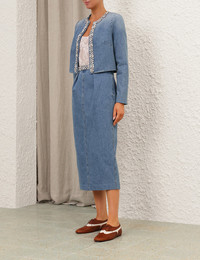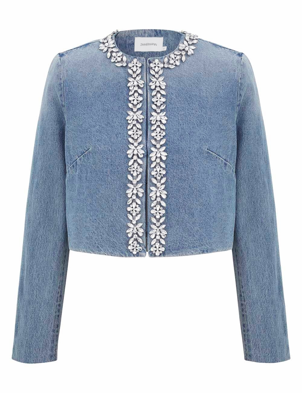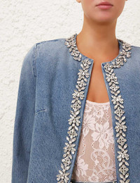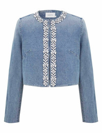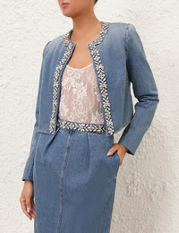 ITEM DETAILS The Crush Embellished Denim Jacket in Blue Moon from our Resort 2025 Collection, Crush. A denim crop jacket featuring crystal trims around the neckline and down the centre front. - Denim cropped jacket - Rounded neckline - Crystal trims around the neckline and down the centre front - Long sleeves Runway: This style was featured on the R25 Runway. Style Code: 2353JR251 SIZE DETAILS 0P 0 1 2 3 Length 46 46 46 49 49 Bust 96 102 106 111 117 Sleeve 59 63 63 64 64 Cropped style fit This garment fits true to size Available in size 0P, suited to clients who are under 5'3"/ 160cm Model is 5'9.5"/178 cm, bust size 32C/10C and wears a size 0 Item measurements have been rounded to the nearest cm CARE INSTRUCTIONS Main : 100% cotton lining : 72% viscose 28% silk Dry clean code f (hydrocarbon only), inside out in a protective bag; Remove detachable trims and accessories prior to cleaning; Cover to protect hardware; Cool iron with protective cloth; Do not spot clean; Always check the label or care card for specific care instructions.