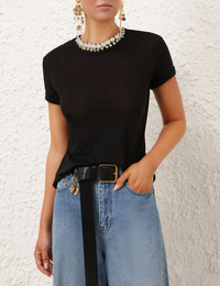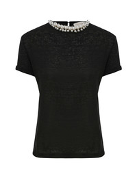 ITEM DETAILS The Crush Embellished Tee in Black from our Resort 2025 Collection, Crush. A linen tee featuring short sleeves and a crew neckline with pearl and crystal trim. - Linen tee - short sleeves - Pearl and crystal detailing on the collar - Centre back keyhole with loop and button - Double turn hemline Runway: This style was featured on the R25 Runway. Style Code: 2638TR251 SIZE DETAILS 0P 0 1 2 3 4 Length 54 58 59 59 60 60 Bust 77 82 87 92 97 102 Sleeve 17 18 19 19 20 20 Regular fit This garment fits true to size Available in size 0P, suited to clients who are under 5'3"/ 160cm Model is 5'9.5"/178 cm, bust size 32C/10C and wears a size 0 Item measurements have been rounded to the nearest cm CARE INSTRUCTIONS Main: 100% linen Dry clean code f (hydrocarbon only), inside out in a protective bag; Remove detachable trims and accessories prior to cleaning; Cover to protect hardware; Cool iron with protective cloth; Do not spot clean; Always check the label or care card for specific care instructions.