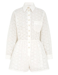 ITEM DETAILS The Crush Embroidered Playsuit in Ivory from our Resort 2025 Collection, Crush. A linen embroidered playsuit featuring white enamel heart shaped buttons down the center front and on the cuffs, a classic collar, and an elasticated waist. - Linen playsuit - Heart shaped buttons on the placket and cuffs - Front chest pocket - Elasticated waist - Lined shorts Style Code: 2557YR251 SIZE DETAILS 0P 0 1 2 3 Length 76 80 82 83 84 Bust 116 122 126 132 137 Elasticated waist for a flexible fit This garment fits true to size Available in size 0P, suited to clients who are under 5'3"/ 160cm Model is 5'9.5"/178 cm, bust size 32C/10C and wears a size 0 Item measurements have been rounded to the nearest cm CARE INSTRUCTIONS Main: 100% linen, contrast: 100% linen, lining: 100% cotton Dry clean code f (hydrocarbon only), inside out in a protective bag; Remove detachable trims and accessories prior to cleaning; Cover to protect hardware; Cool iron with protective cloth; Do not spot clean; Always check the label or care card for specific care instructions.