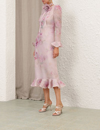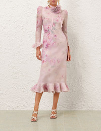ITEM DETAILS The Crush Flower Midi Dress in Pink Floral from our Resort 2025 Collection, Crush. A silk linen midi dress featuring frilled detail on hemline and on the cuff; finished with a detachable ruffle flower brooch. - Silk linen midi dress featuring - Frilled detail on hem and cuffs - Gathered sleeve head with tulle insert - Crew neckline with detachable ruffle flower brooch - Invisible zip down centre back Style Code: 2337DR251 SIZE DETAILS 0P 0 1 2 3 4 Length 118 128 129 129 130 131 Bust 82 88 92 98 102 108 Sleeve 63 67 67 68 69 69 Waist 68 72 76 82 86 92 Hip 92 96 102 106 112 116 Fitted waist and shoulders This garment fits true to size Available in size 0P, suited to clients who are under 5'3"/ 160cm Model is 5'9.5"/178 cm, bust size 32C/10C and wears a size 0 Item measurements have been rounded to the nearest cm CARE INSTRUCTIONS Main: 55% linen, 45% silk, flower: 55% linen, 45% silk, lining: 100% cotton Dry clean code f (hydrocarbon only), inside out in a protective bag; Remove detachable trims and accessories prior to cleaning; Cover to protect hardware; Cool iron with protective cloth; Do not spot clean; Always check the label or care card for specific care instructions.