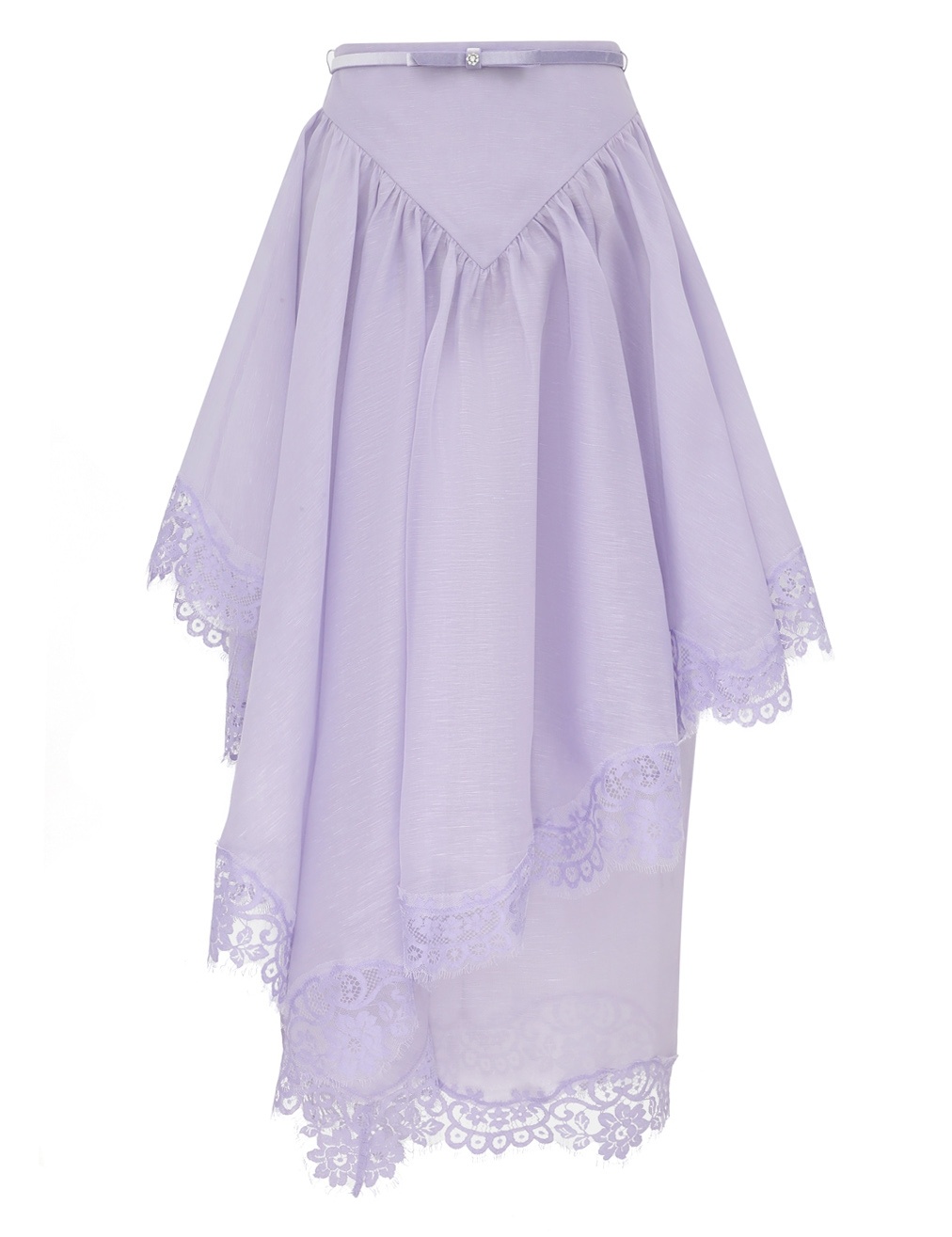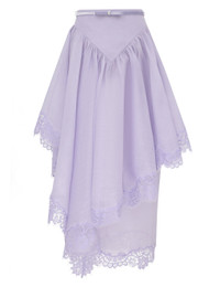 ITEM DETAILS The Crush Lace Trim Skirt in Jacaranda from our Resort 2025 Collection, Crush. A silk linen midi skirt featuring gathered frills with lace trims, an invisible center back zip with hook and eye closure and a removable bow belt. - Silk linen midi skirt - Invisible centre back zip with hook and eye - Heavily gathered skirt frills from the yoke - Lace trims on the hemline - Removable belt Runway: This style was featured on the R25 Runway. Style Code: 2042SR251 SIZE DETAILS 0P 0 1 2 3 Length 84 92 92 92 92 Waist 63 66 71 76 81 Fitted at the waist and hips, relaxed through legs This garment fits true to size Available in size 0P, suited to clients who are under 5'3"/ 160cm Model is 5'9.5"/178 cm, bust size 32C/10C and wears a size 0 Item measurements have been rounded to the nearest cm CARE INSTRUCTIONS Main: 55% linen, 45% silk, trim: 65% cotton, 35% polyamide, trim: 100% cotton Dry clean code f (hydrocarbon only), inside out in a protective bag; Remove detachable trims and accessories prior to cleaning; Cover to protect hardware; Cool iron with protective cloth; Do not spot clean; Always check the label or care card for specific care instructions.