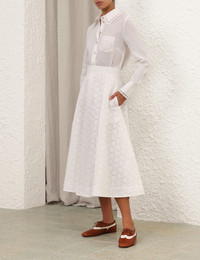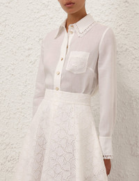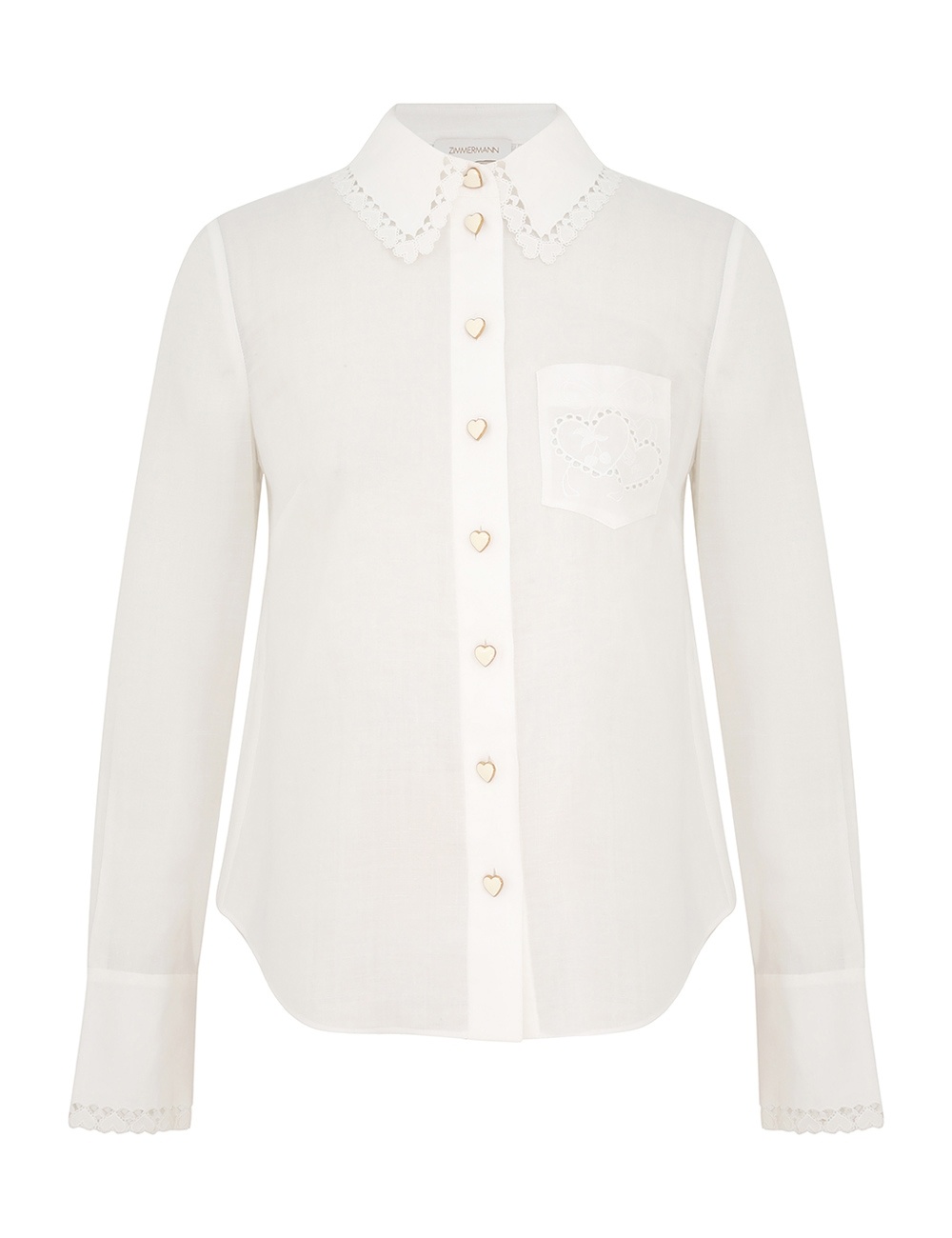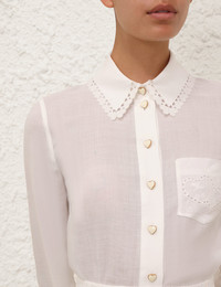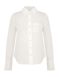 ITEM DETAILS The Crush Ramie Embroidered Shirt in Ivory from our Resort 2025 Collection, Crush. A ramie long sleeve shirt featuring a classic collar, a patch pocket and placement embroidery around collar and cuff edge. - Ramie blouse - Long sleeves with gathered cuff featuring buttons - Embroidery around collar and cuff edge - Heart buttons down the centre front - Centre back box pleat Style Code: 2564TR251 SIZE DETAILS 0P 0 1 2 3 4 Length 60 65 65 66 66 67 Bust 91 96 101 106 112 117 Sleeve 49 53 54 55 55 56 Fitted through the shoulders and bust This garment fits true to size Available in size 0P, suited to clients who are under 5'3"/ 160cm Model is 5'9.5"/178 cm, bust size 32C/10C and wears a size 0 Item measurements have been rounded to the nearest cm CARE INSTRUCTIONS Main: 100% ramie Dry clean code f (hydrocarbon only), inside out in a protective bag; Remove detachable trims and accessories prior to cleaning; Cover to protect hardware; Cool iron with protective cloth; Do not spot clean; Always check the label or care card for specific care instructions.
