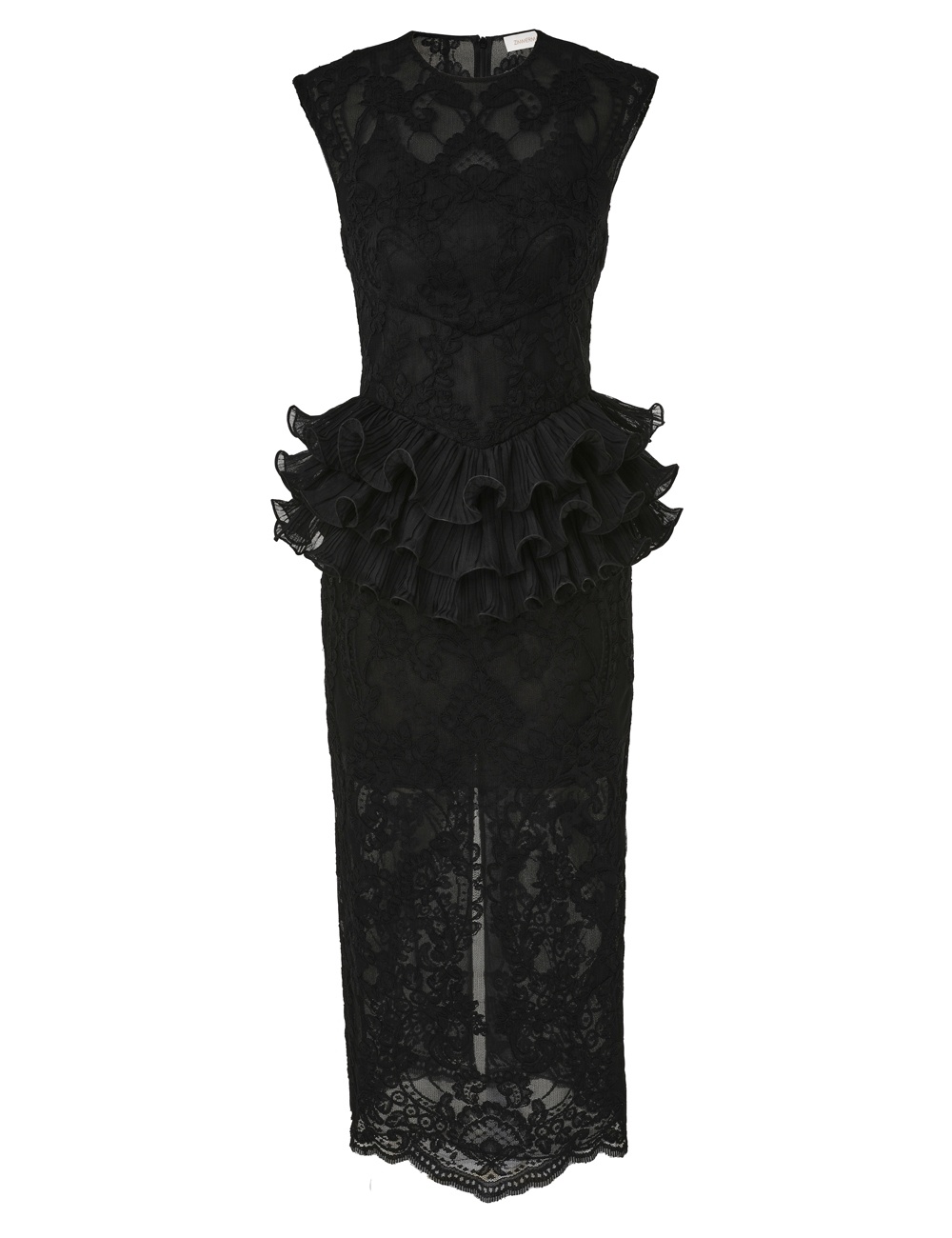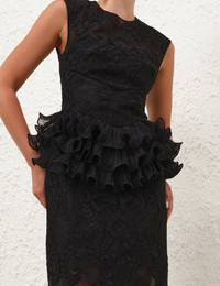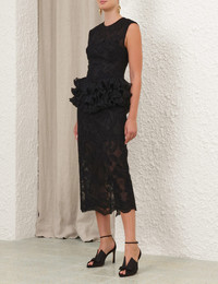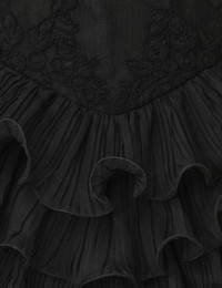 ITEM DETAILS The Crush Lace Frill Midi Dress in Black from our Resort 2025 Collection, Crush. A midi dress featuring a crew neckline, gathered pleated frills around the hips and an invisible centre back zip closure. - Midi dress - Lace trim along the sleeves and hemline - Scalloped edge detailing at the hemline - Invisible centre back zip closure - Centre back vent opening - Comes with separate slip Runway: This style was featured on the R25 Runway. Style Code: 2157DR251 SIZE DETAILS 0P 0 1 2 3 Length 120 131 131 132 133 Bust 80 86 90 96 102 Waist 68 70 76 80 86 Hip 94 98 104 108 114 Fitted This garment fits true to size Available in size 0P, suited to clients who are under 5'3"/ 160cm Model is 5'9.5"/178 cm, bust size 32C/10C and wears a size 0 Item measurements have been rounded to the nearest cm CARE INSTRUCTIONS Main: 100% polyester, contrast: 100% silk, slip: 81% polyester, 19% elastane, trim: 100% polyester Dry clean code f (hydrocarbon only), inside out in a protective bag; Remove detachable trims and accessories prior to cleaning; Cover to protect hardware; Cool iron with protective cloth; Do not spot clean Slip: Dry clean code f (hydrocarbon only), inside out in a protective bag; Remove detachable trims and accessories prior to cleaning; Cover to protect hardware; Cool iron with protective cloth; Do not spot clean; Always check the label or care card for specific care instructions.