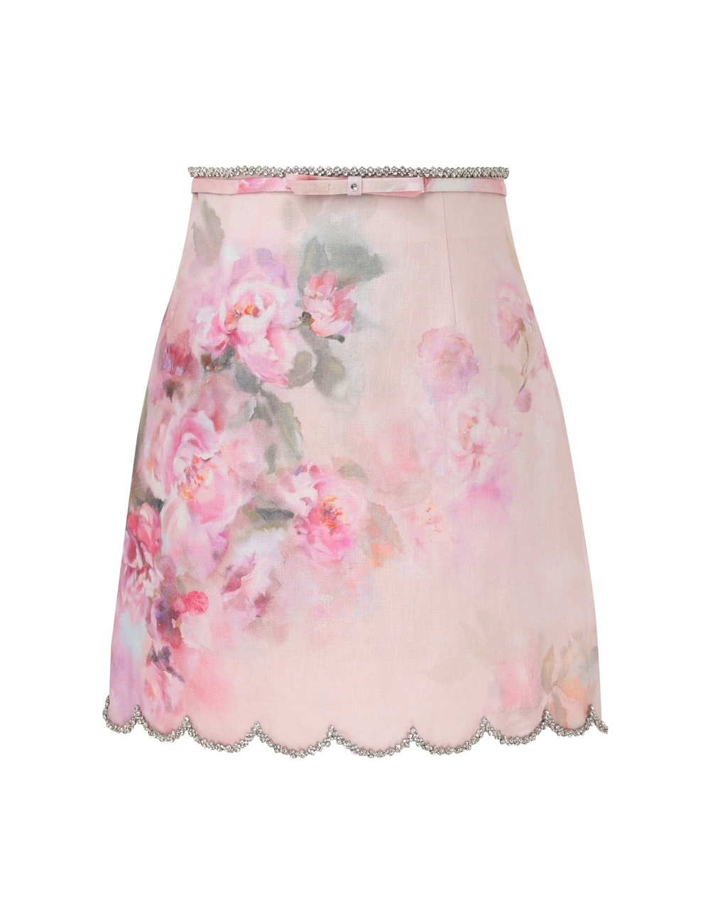 ITEM DETAILS The Crush Scalloped Mini Skirt in Pink Floral from our Resort 2025 Collection, Crush. A linen mini skirt featuring a placement print, centre back zip closure and crystal trims at the hemline and waist. - Linen high waisted mini skirt - Scalloped crystal trim at the hemline - Crystal trim at the waist - Zip closure at centre back - Removable bow belt Runway: This style was featured on the R25 Runway. Style Code: 2164SR251 SIZE DETAILS 0P 0 1 2 3 Length 43 45 45 46 47 Waist 65 68 73 78 84 Fitted high waist Straight fit through hips and legs This garment fits true to size Available in size 0P, suited to clients who are under 5'3"/ 160cm Model is 5'9.5"/178 cm, bust size 32C/10C and wears a size 0 Item measurements have been rounded to the nearest cm CARE INSTRUCTIONS Main: 100% linen, lining: 100% cotton Dry clean code f (hydrocarbon only), inside out in a protective bag; Remove detachable trims and accessories prior to cleaning; Cover to protect hardware; Cool iron with protective cloth; Do not spot clean; Always check the label or care card for specific care instructions.