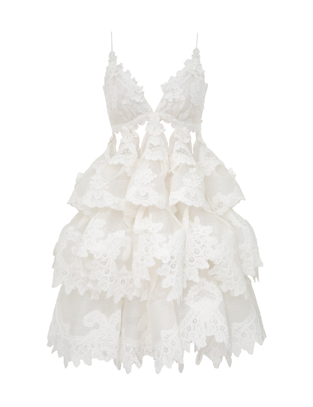 ITEM DETAILS The Crush Tiered Lace Dress in Ivory from our Resort 2025 Collection, Crush. A silk linen tiered mini dress featuring a plunging V-neckline with cutouts under bust, an elastic strap at the centre back with a clasp and lace trim appliques throughout. - Silk linen mini dress - Centre back invisible zip through godets - Adjustable straps - Crinoline inserted in bottom godet tiers - Lace motifs throughout Runway: This style was featured on the R25 Runway. Style Code: 2387DR251 SIZE DETAILS 0P 0 1 2 3 Length 55 59 59 59 59 Hip 88 92 98 102 108 Under bust 58 64 68 74 78 Fitted through the bust and waist Relaxed through hips and legs This garment fits true to size Available in size 0P, suited to clients who are under 5'3"/ 160cm Model is 5'9.5"/178 cm, bust size 32C/10C and wears a size 0 Item measurements have been rounded to the nearest cm CARE INSTRUCTIONS Main: 55% linen, 45% silk, : 100% viscose, : 100% polyester Dry clean code f (hydrocarbon only), inside out in a protective bag; Remove detachable trims and accessories prior to cleaning; Cover to protect hardware; Cool iron with protective cloth; Do not spot clean; Always check the label or care card for specific care instructions.