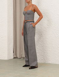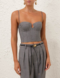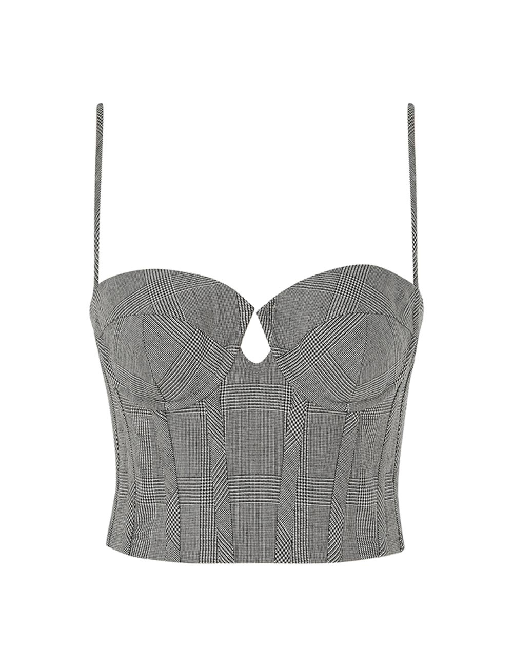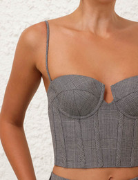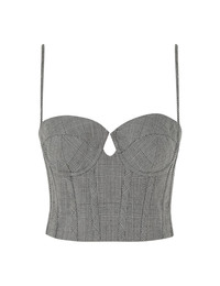 ITEM DETAILS The Crush Check Bustier in Check from our Resort 2025 Collection, Crush. A wool blend bodice featuring a corset style, underwire with boning in the bust, and a shirred back with a zip closure. - Wool blend corset - Underwire with boning - Shirred detail at the center back with zip closure - Adjustable straps Runway: This style was featured on the R25 Runway. Style Code: 2523TR251 SIZE DETAILS 0P 0 1 2 3 Length 16 18 18 18 18 Waist 58 60 66 70 76 Fitted This garment fits true to size Available in size 0P, suited to clients who are under 5'3"/ 160cm Model is 5'9.5"/178 cm, bust size 32C/10C and wears a size 0 Item measurements have been rounded to the nearest cm CARE INSTRUCTIONS Main: 50% wool, 25% viscose, 25% polyester, lining: 75% viscose, 25% silk Dry clean code f (hydrocarbon only), inside out in a protective bag; Remove detachable trims and accessories prior to cleaning; Cover to protect hardware; Cool iron with protective cloth; Do not spot clean; Always check the label or care card for specific care instructions.