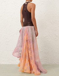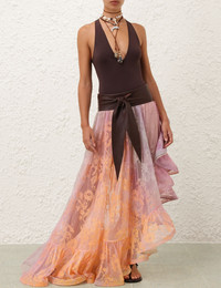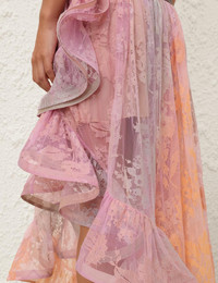ITEM DETAILS The Dawning Lace Billow Skirt in Sunset from our Spring 2025 Collection, Illumination. A lace maxi skirt featuring an asymmetric hemline with statement ruffle details with an overlapped side split, finished with a drawstring waist. - Lace maxi skirt - Drawstring waist - Asymmetric hemline - Statement ruffle details - Overlapped side split - Invisible zip on right side with hook and eye closure - Lined Runway: This style was featured on the S25 Runway. Style Code: 3081SS252 SIZE DETAILS 0P 0 1 2 3 4 Length 96 105 105 105 105 105 Waist 66 68 74 78 84 88 Fitted through the waist, relaxed through the hips and legs This garment fits true to size Available in size 0P, suited to clients who are under 5'3"/ 160cm Model is 5'9.5"/178 cm, bust size 32C/10C and wears a size 0 Item measurements have been rounded to the nearest cm CARE INSTRUCTIONS Main: 60% polyamide, 40% cotton; lining: 100% viscose Dry clean only code f (hydrocarbon only); Cover to protect trim; Cool iron with protective cloth; Do not spot clean ; Always check the label or care card for specific care instructions.