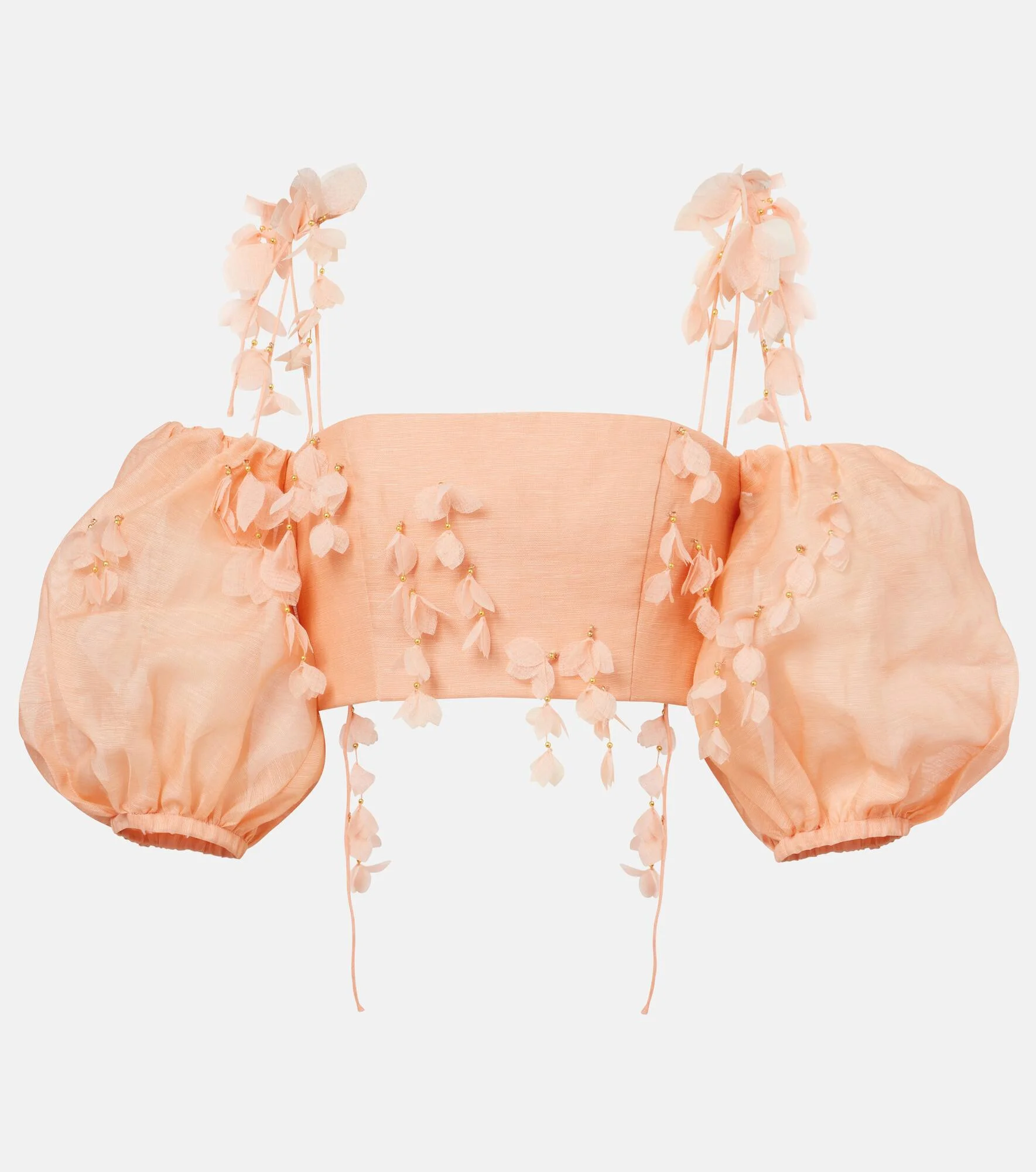 Ethereal and romantic barely scratch the surface when describing a Zimmermann piece. Made from linen and silk, the Dawning crop top features a shirred back, puff sleeves, and petal-inspired embellishments. Product Details - Material: 52% linen, 48% silk - Care instructions: machine wash cold - Made in China - Designer color name: Coral - Item color: orange - Closure: zipped back - Item number: P01046557 Size & Fit - True to size - Elasticated top - Fitted - Non-stretchy fabric - Cropped - The model seen in the picture is 178cm-5'10" and wearing a size 0