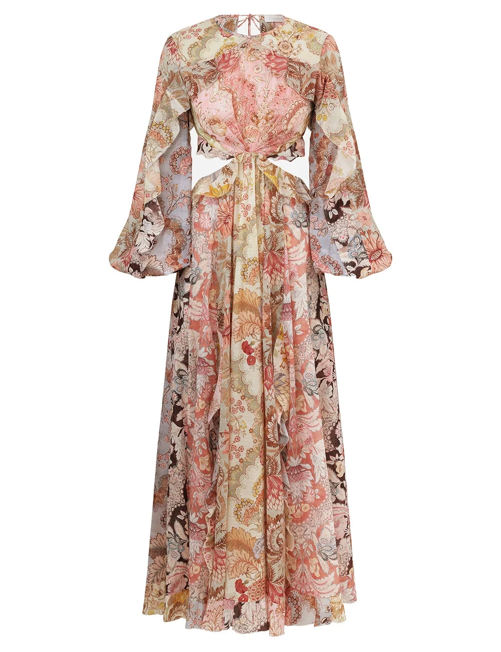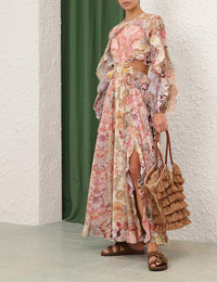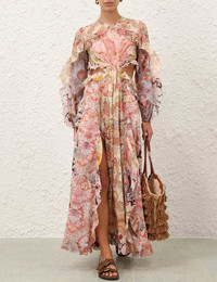ITEM DETAILS The Daylight Billow Dress in Spliced Print from our Resort Swim 2026 Collection. A cotton maxi dress featuring a round neckline, long billow sleeves with elasticated cuffs and side waist cut-outs, finished with an open back and heavy gathering throughout. - 100% cotton fabric - Maxi gown with front high skirt splits - Centre back necktie with tassels - Invisible centre back zip at skirt - Frill detailing throughout - Spliced pattern - Lined Style Code: 6162DRS263 SIZE DETAILS 0P 0 1 2 3 4 Length 52.5 56.5 57 57.5 57.5 58 Bust 36 38 40 41.5 44 45.5 Sleeve 24 25.5 25.5 26 26 26.5 Fitted at the bust, relaxed through the legs This garment fits true to size Available in size 0P, suited to clients who are under 5'3"/ 160cm Model is 5'9.5"/178 cm, bust size 32C/10C and wears a size 0 Item measurements are in inches CARE INSTRUCTIONS Main: 100% cotton; lining: 100% cotton Dry clean only code f (hydrocarbon only); Remove any detachable trims prior to dry cleaning; Cover to protect trim; Iron in low temperature with protective cloth; Light steam only; Do not spot clean Always check the label or care card for specific care instructions.