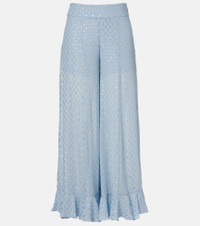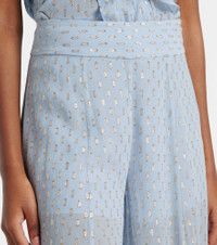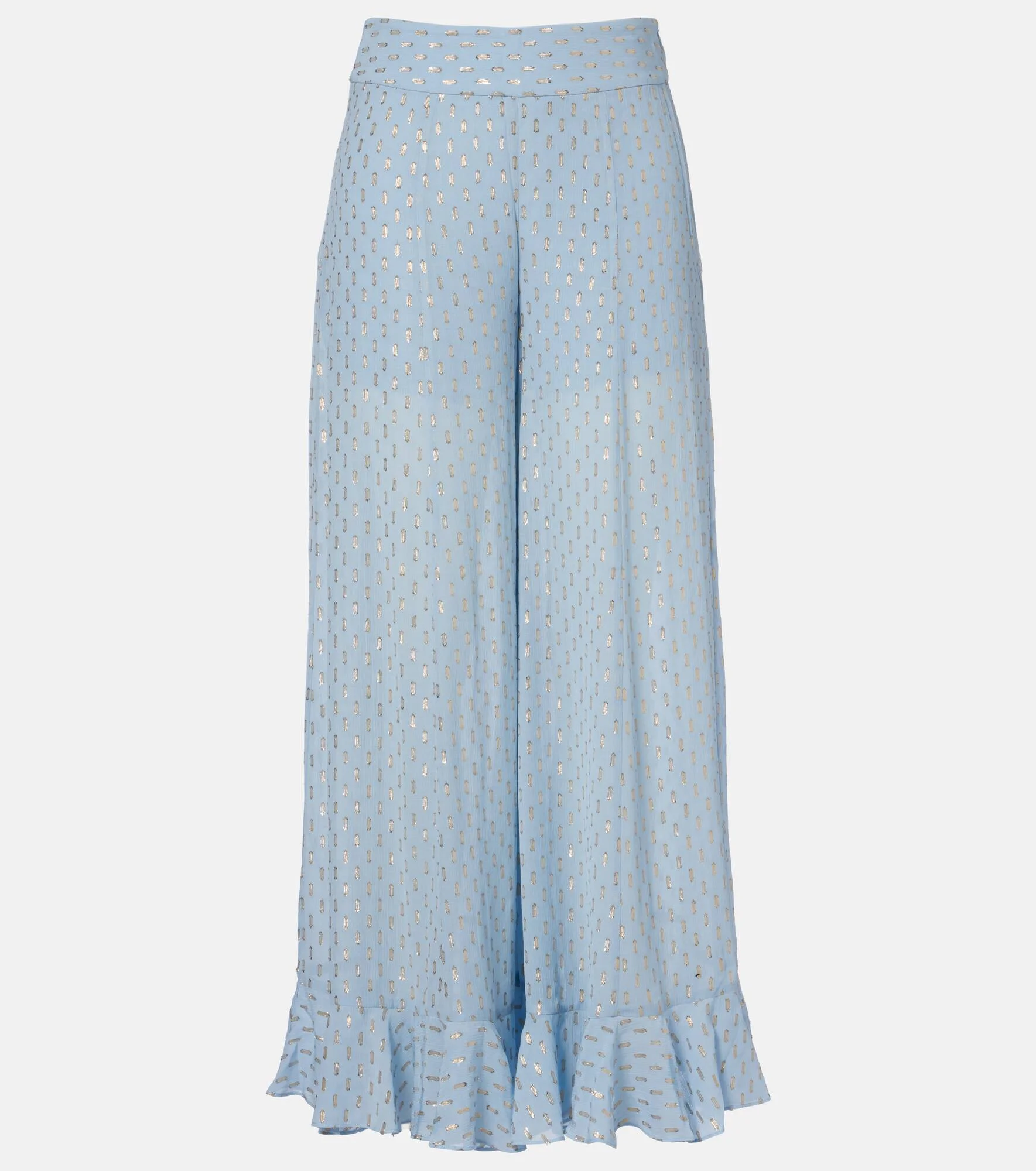 Ethereal and romantic barely scratch the surface when describing a Zimmermann piece. The Daylight pants boast a semi-sheer, chiffon construction with a flowing, wide-leg silhouette adorned with a light-catching metallic pattern. Product Details - Material: 95% viscose, 5% metallic fibres - Care instructions: dry clean - Made in China - Color: blue - Designer color name: Blue - Lining: 100% viscose - Closure: concealed zipped side - Item number: P01129871 Size & Fit - Fits large to size - we recommend trying one size smaller - Non-stretchy fabric - Wide-leg - The model seen in the picture is 178cm-5'10" and wearing a size 00