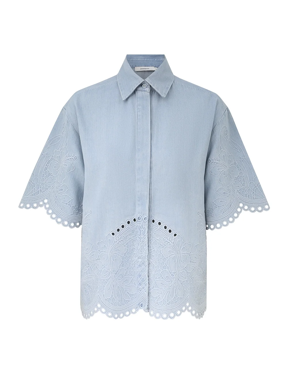 ITEM DETAILS The Daylight Denim Shirt in Ice Storm from our Resort Swim 2026 Collection. A denim shirt featuring a classic collar, concealed front opening, finished with scalloped trim and embroidery throughout. - Denim relaxed fit shirt - Midi-length sleeves with wide cuffs - Concealed denim buttons - Embroidered detailing on the sleeves and hem Style Code: 7214TRS263 SIZE DETAILS 0P 0 1 2 3 4 Length 24 26.5 27 27 27 27 Bust 40 42.5 45 46.5 49 50.5 Waist 40 42.5 45 46.5 49 50.5 Sleeve 11.5 12 12 12 12 12 Designed for a relaxed fit This garment fits true to size Available in size 0P, suited to clients who are under 5'3"/ 160cm Model is 5'9.5"/178 cm, bust size 32C/10C and wears a size 0 Item measurements are in inches CARE INSTRUCTIONS Main: 100% cotton; embroidery: 100% polyester Gentle cold machine wash separately with mild detergent; Remove any detachable trims prior to cleaning Cover to protect trim; Do not soak or bleach; Do not tumble dry; Dry in shade without delay; Iron in low temperature with protective cloth; Do not spot clean; Dry cleanable code p Always check the label or care card for specific care instructions.