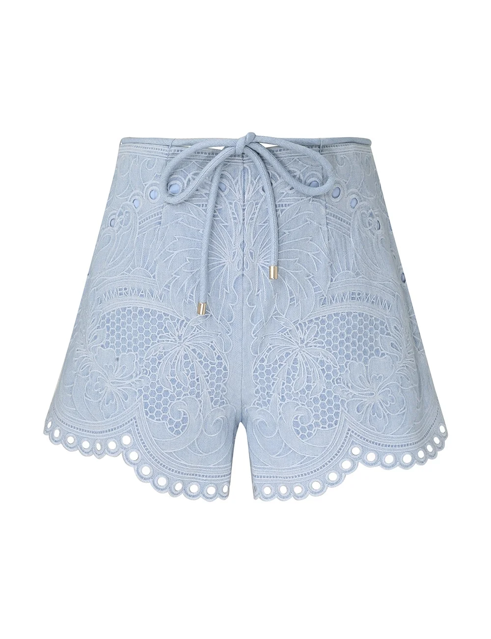 ITEM DETAILS The Daylight Denim Short in Ice Storm from our Resort Swim 2026 Collection. A denim short featuring heavy embroidery and scalloped hem detailing. - Denim mid-rise short - Drawstring waistband with toggle ends - Functional side pockets - Chain stitch belt loops at side seams - Invisible zip at centre back - Lined Style Code: 7215ARS263 SIZE DETAILS 0P 0 1 2 3 4 Length 11.5 11.5 12 12 12 12 Waist 24.5 26 28.5 30 32.5 34 Hip 36 38 40 42.5 44 46.5 Inseam 3 3 3 3 3 3 Designed to be fitted at waist, relaxed through hips and legs This garment fits true to size Available in size 0P, suited to clients who are under 5'3"/ 160cm Model is 5'9.5"/178 cm, bust size 32C/10C and wears a size 0 Item measurements are in inches CARE INSTRUCTIONS Main: 100% cotton; lining: 98% polyester, 2% other fibres; embroidery: 100% polyester Gentle cold machine wash separately with mild detergent; Remove any detachable trims prior to cleaning Cover to protect trim; Do not soak or bleach; Do not tumble dry; Dry in shade without delay; Iron in low temperature with protective cloth; Do not spot clean; Dry cleanable code p Always check the label or care card for specific care instructions.