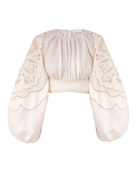 ITEM DETAILS The Daylight Embroidered Bodice in Cream from our Resort Swim 2026 Collection. A linen cropped top featuring a round neckline, long billow sleeves with elasticated cuffs, finished with an asymmetric hem and invisible zip closure at centre back. - Linen cropped top - Ruched bust - Shirred centre back waistband with zip closure - Boning at side back - Placement embroidery - Lace trim throughout Style Code: 5974TRS263 SIZE DETAILS 0P 0 1 2 3 4 Length 11 12 12 12 12 12.5 Waist 25 27 29 30.5 33 34.5 Sleeve 28 29.5 30 30.5 30.5 27.5 Slightly fitted at the bust and waist Light-weight, non-stretchy fabric This garment fits true to size Available in size 0P, suited to clients who are under 5'3"/ 160cm Model is 5'9.5"/178 cm, bust size 32C/10C and wears a size 0 Item measurements are in inches CARE INSTRUCTIONS Main: 100% linen; contrast: 100% cotton; embroidery: 100% polyester Dry clean only code f (hydrocarbon only); Remove any detachable trims prior to dry cleaning; Cover to protect trim; Iron in low temperature with protective cloth; Light steam only; Do not spot clean Always check the label or care card for specific care instructions.