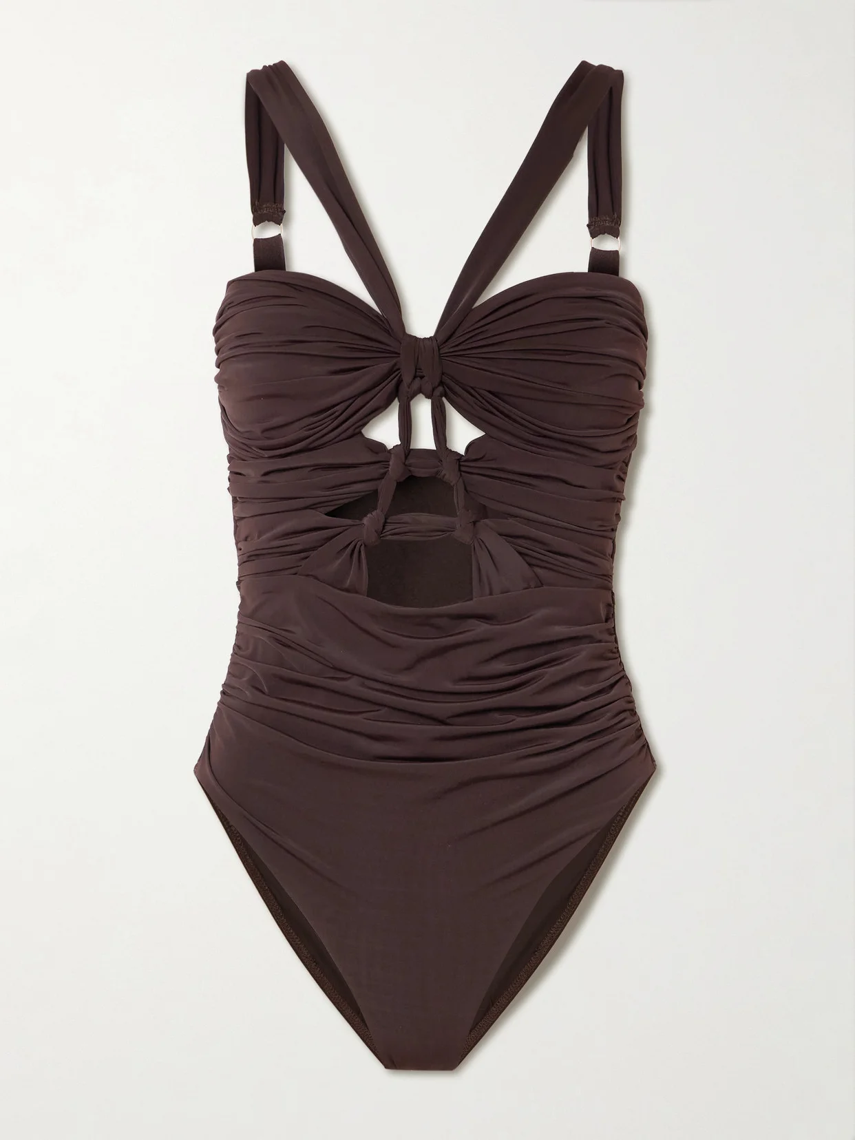 Zimmermann's 'Daylight' swimsuit has a trio of cutouts through the front framed by knots and ruching. it's made from supportive stretch fabric and offers medium coverage.