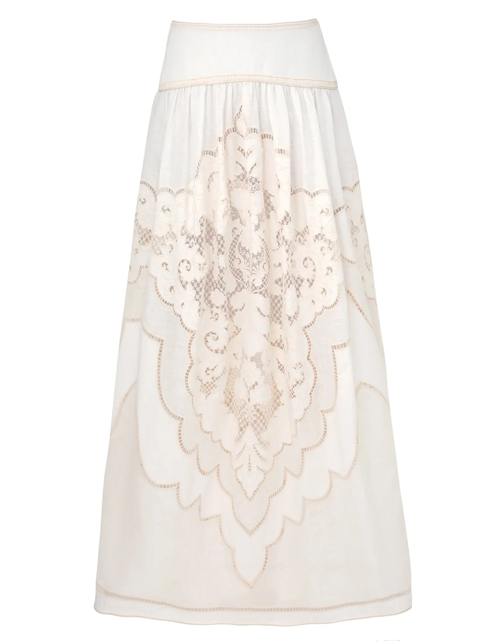 ITEM DETAILS The Daylight Maxi Skirt in Cream from our Resort Swim 2026 Collection. A linen maxi skirt featuring a fixed waistband and embroidery detailing throughout. - Linen fabric - High-rise, full-length skirt - Invisible centre back zip closure - Heavily gathered - Placement embroidery - Mini length lining Style Code: 6012SRS263 SIZE DETAILS 0P 0 1 2 3 4 Length 36 39.5 39.5 39.5 39.5 39.5 Waist 25 26 28.5 30.5 32.5 34.5 Fitted at the waist and hips, relaxed through the legs This garment fits true to size Available in size 0P, suited to clients who are under 5'3"/ 160cm Model is 5'9.5"/178 cm, bust size 32C/10C and wears a size 0 Item measurements are in inches CARE INSTRUCTIONS Main: 100% linen; contrast: 100% cotton; embroidery: 100% polyester; lining: 100% cotton Dry clean only code f (hydrocarbon only); Remove any detachable trims prior to dry cleaning; Cover to protect trim; Iron in low temperature with protective cloth; Light steam only; Do not spot clean Always check the label or care card for specific care instructions.