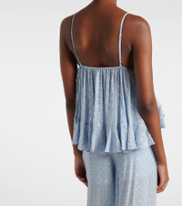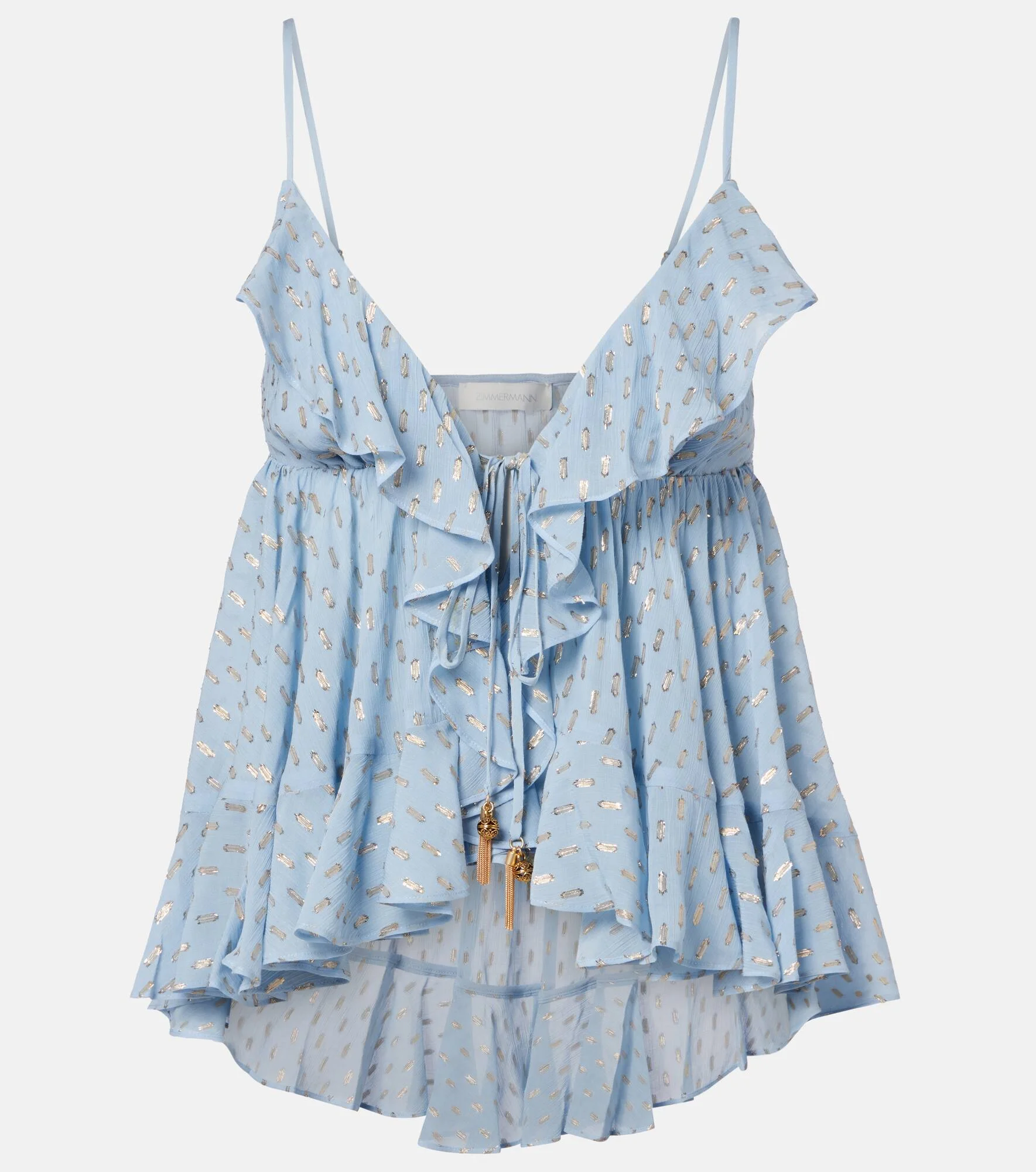 Ethereal and romantic barely scratch the surface when describing a Zimmermann piece. The Daylight top is made to a ruffled camisole design with glinting metallic delights designed to catch the light. Product Details - Material: 95% viscose, 5% metallic fibres - Care instructions: dry clean - Made in China - Color: blue - Designer color name: Blue - Lining: 100% viscose - Hardware color: gold - Drawstring collar - Adjustable shoulder straps - Item number: P01129870 Size & Fit - True to size - Cinched waist - Non-stretchy fabric - Falls to the hip - The model seen in the picture is 178cm-5'10" and wearing a size 0