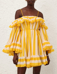 ITEM DETAILS The Daylight Stripe Mini Dress in Yellow/Cream Stripe from our Resort Swim 2026 Collection. A cotton mini dress featuring a straight neckline with frill overlay, off-the-shoulder wide sleeves with spaghetti straps, finished with a self-rouleau tie at the back and heavy gathering throughout. - 100% cotton fabric - Gathered straight neckline with ruffle overlay - Internal boning at side seams and back bodice - Partially open back with self-tie - Centre back invisible zip on skirt - Lined Style Code: 6441DRS263 SIZE DETAILS 0P 0 1 2 3 4 Length 23 23 23 23 23 23 Waist 26 27 29 31.5 33 35.5 Sleeve 18 19.5 19.5 19.5 19.5 19.5 Designed for a relaxed fit This garment fits true to size Available in size 0P, suited to clients who are under 5'3"/ 160cm Model is 5'9.5"/178 cm, bust size 32C/10C and wears a size 0 Item measurements are in inches CARE INSTRUCTIONS Main: 100% cotton; lining: 100% cotton Dry clean only code f (hydrocarbon only); Remove any detachable trims prior to dry cleaning; Cover to protect trim; Iron in low temperature with protective cloth; Light steam only; Do not spot clean Always check the label or care card for specific care instructions.