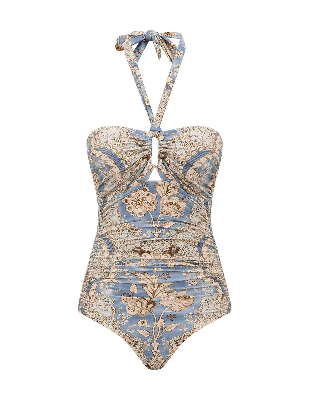 ITEM DETAILS The Daylight Wide link 1PC in Bandana Floral Denim from our Resort Swim 2026 Collection. A halter neck one piece featuring ruching throughout the body and a wide link detail at the centre bust. - Lycra bandeau with shiny finish - Full coverage bottoms - Removable cups - Self-tie halter neck - Gripper elastic and boning for hold and bust support Style Code: 0171WRS263 SIZE DETAILS This garment fits true to size Model is 5'10.5"/179 cm, bust size 34C/12C and wears a size 0 CARE INSTRUCTIONS Main: 80% polyamide, 20% elastane; lining: 92% recycled nylon, 8% elastane Do not roll up when wet; Rinse immediately after use; Remove any detachable trims prior to washing; Cold hand wash separately with mild detergent, avoid fabric softener; Dry in shade; Do not bleach or iron; Do not tumble dry; Do not dry clean; Light colours may be transparent when wet; Avoid contact with sunscreens, oils, rough surfaces, and high temperature pools and spas; Always check the label or care card for specific care instructions.