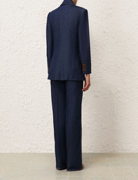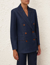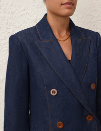 ITEM DETAILS The Denim Blazer in Ink from our Spring 2024 Collection, Natura. An oversized denim blazer featuring a tailored tuxedo silhouette and buttons at the front opening. - Relaxed fit denim blazer - Tailored tuxedo silhouette - Long sleeves - Front functional pockets with jets - Keyhole buttonhole at the front opening - Lined Style Code: 1356JZES SIZE DETAILS 0P 0 1 2 3 Length 70 74 75 76 76 Bust 88 92 98 102 108 Waist 84 88 94 98 104 Hip 96 102 106 112 116 Sleeve 57 61 62 63 63 Tailored fit This garment fits true to size Available in size 0P, suited to clients who are under 5'3"/ 160cm Model is 5'9.5"/178 cm, bust size 32C/10C and wears a size 0 Item measurements have been rounded to the nearest cm CARE INSTRUCTIONS Main : 82% cotton, 17% lyocell, 1% elastane Lining : 72% viscose, 28% silk Exclusive of trims Dry clean only code p inside out with protective bag Remove detachable trims and accessories prior cleaning Cover and protect hardware Cool iron with protective cloth Light steam only if required Do not spot clean Always check the garment care label for specific care instructions.