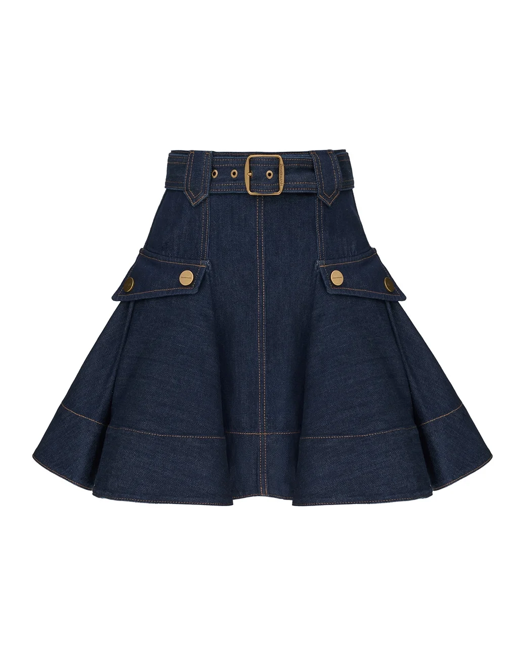 ITEM DETAILS The Denim Cargo Mini Skirt in Harbour Blue from our Spring 2026 Collection, Kindred Spirit. A denim mini skirt featuring a fixed mid-rise waistband with thick loops, removable belt and side pockets, finished with a full flare hem and topstitching throughout. - Denim cotton fabric - Mid-rise, mini-length skirt - Waist belt with gold hardware buckle - Decorative front pockets with angled flaps - Centre back metal zip - Side seam pockets - Gold stud detailing throughout Style Code: 7686SS26R SIZE DETAILS 0P 0 1 2 3 4 Length 15.5 17 17 17.5 17.5 18 Waist 25 27 29 30.5 33 34.5 Fitted at the waist, relaxed through the skirt Heavy-weight, rigid denim This garment fits true to size Available in size 0P, suited to clients who are under 5'3"/ 160cm Model is 5'9.5"/178 cm, bust size 32C/10C and wears a size 0 Item measurements are in inches CARE INSTRUCTIONS Main and belt: 100% cotton; pocketing: 65% polyester, 35% cotton Gentle cold machine wash separately with mild detergent; Remove any detachable trims prior to cleaning Cover to protect trim; Do not soak or bleach; Do not tumble dry; Dry in shade without delay; Iron in low temperature with protective cloth; Do not spot clean; Dry cleanable code p Always check the label or care card for specific care instructions.