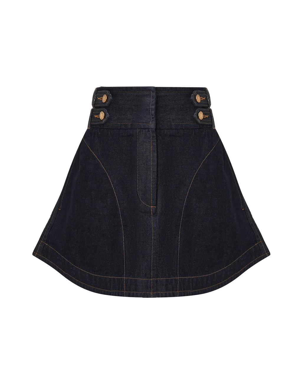 ITEM DETAILS The Denim Cargo Mini Skirt in Night Sky from our Cruise 2026 Collection, Twisted Romance. A denim mini skirt featuring a fitted waistband with bar tabs, gold button detailing, finished with topstitching throughout. - Denim mini skirt - Buttoned waistband tabs and belt loops - Centre front zip closure with hook and bar - Asymmetric hem - Heavily gathered Style Code: 7218SC26R SIZE DETAILS 0P 0 1 2 3 4 Length 47 33.5 33.5 33.5 33.5 33.5 Waist 26 27.5 29 31.5 33 35.5 Hip 47 49 51 53 55 57.5 Adjustable buttoned waist tabs for a custom fit Heavy-weight, non-stretchy fabric This garment fits true to size Model is 5'9.5"/178 cm, bust size 32C/10C and wears a size 26 Item measurements are in inches CARE INSTRUCTIONS Main: 75% cotton, 25% viscose; pocketing: 65% polyester, 35% cotton Gentle cold machine wash separately with mild detergent; Remove any detachable trims prior to cleaning Cover to protect trim; Do not soak or bleach; Do not tumble dry; Dry in shade without delay; Iron in low temperature with protective cloth; Do not spot clean; Dry cleanable code p Always check the label or care card for specific care instructions.