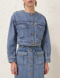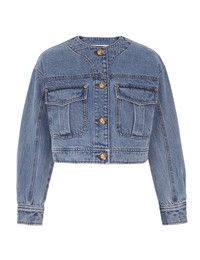 ITEM DETAILS The Denim Cropped Jacket in Dawn Blue from our Fall 2025 Collection, Hypnotic. A denim cropped style jacket featuring a round neckline and large gold buttons down the centre front. - 100% cotton denim fabric - Scooped round neckline - Centre front placket with gold buttons - Front chest flap pockets - Stitching throughout - Cropped fit Style Code: 4949JF25R SIZE DETAILS 0P 0 1 2 3 4 Length 41 45 45 46 47 47 Bust 100 104 110 114 120 126 Sleeve 48 52 53 54 54 55 Designed for a relaxed, cropped fit This garment fits true to size Available in size 0P, suited to clients who are under 5'3"/ 160cm Model is 5'9.5"/178 cm, bust size 32C/10C and wears a size 0 Item measurements have been rounded to the nearest cm CARE INSTRUCTIONS 100% cotton Gentle cold machine wash separately with mild detergent; Remove any detachable trims prior to cleaning Cover to protect trim; Do not soak or bleach; Do not tumble dry; Dry in shade without delay; Cool iron with protective cloth; Do not spot clean; Dry cleanable code p Always check the label or care card for specific care instructions.