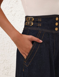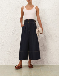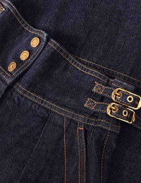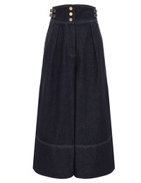 ITEM DETAILS The Denim Culotte in Night Sky from our Spring 2026 Collection, Kindred Spirit. A high waisted denim pant featuring a fixed waistband with centre front gold buttons, side tabs, pockets and a flared hem. - Denim flare pant - Elongated fixed waistband with buckle tabs - Functional gold buttons - Side seam pockets - Wide, exaggerated hem Style Code: 5233PS26R SIZE DETAILS 0P 0 1 2 3 4 Length 79 87 88 88 89 90 Waist 68 70 76 80 86 90 Hip 110 116 120 126 130 136 Inseam 53 59 59 59 59 59 Designed to be fitted at the waist Relaxed throughout hips and legs High-rise waist with cropped length This garment fits true to size Available in size 0P, suited to clients who are under 5'3"/ 160cm Model is 5'9.5"/178 cm, bust size 32C/10C and wears a size 0 Item measurements have been rounded to the nearest cm CARE INSTRUCTIONS Main: 75% cotton, 25% viscose; lining: 86% polyester, 14% cotton Gentle cold machine wash separately with mild detergent; Remove any detachable trims prior to cleaning Cover to protect trim; Do not soak or bleach; Do not tumble dry; Dry in shade without delay; Cool iron with protective cloth; Do not spot clean; Dry cleanable code p Always check the label or care card for specific care instructions.