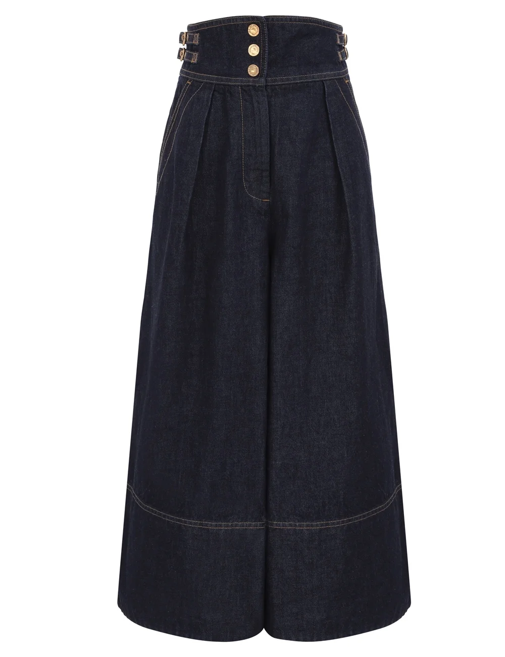 ITEM DETAILS The Denim Culotte in Night Sky from our Fall 2025 Collection, Hypnotic. A high waisted denim pant featuring a fixed waistband with centre front gold buttons, side tabs, pockets and a flared hem. - Denim flare pant - Elongated fixed waistband with buckle tabs - Functional gold buttons - Side seam pockets - Wide, exaggerated hem Style Code: 5233PF25R SIZE DETAILS 0P 0 1 2 3 4 Length 79 87 88 88 89 90 Waist 68 70 76 80 86 90 Hip 110 116 120 126 130 136 Inseam 53 59 59 59 59 59 Designed to be fitted at the waist, relaxed throughout hips and legs High-rise waist with cropped length This garment fits true to size Available in size 0P, suited to clients who are under 5'3"/ 160cm Model is 5'9.5"/178 cm, bust size 32C/10C and wears a size 0 Item measurements have been rounded to the nearest cm CARE INSTRUCTIONS Main : 75% cotton 25% viscose lining : 86% polyester 14% cotton Gentle cold machine wash separately with mild detergent; Remove any detachable trims prior to cleaning Cover to protect trim; Do not soak or bleach; Do not tumble dry; Dry in shade without delay; Cool iron with protective cloth; Do not spot clean; Dry cleanable code p Always check the label or care card for specific care instructions.