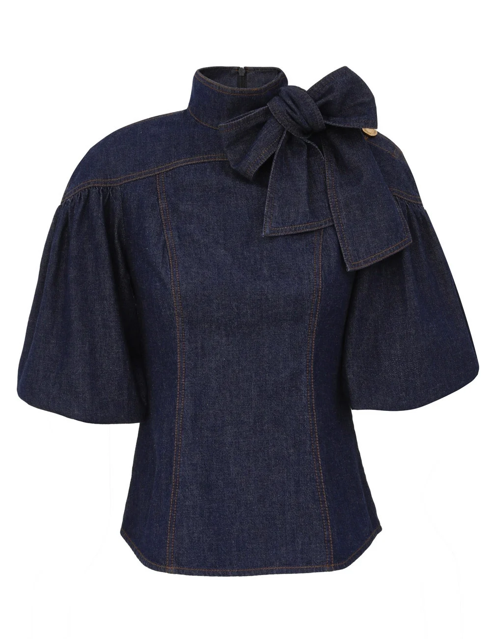 ITEM DETAILS The Denim Fitted Blouse in Ink from our Fall 2025 Collection, Hypnotic. A denim blouse featuring a stand collar, pussybow necktie, billow sleeves with elasticated cuffs and an invisible zip closure at the centre back. - 100% cotton denim - Asymmetrical hem - Quarter-length billow sleeves with elasticated cuffs - Pussybow necktie with gold button detailing - Invisible zip closure at centre back - Topstitch detailing throughout Style Code: 5009TF25R SIZE DETAILS 0P 0 1 2 3 4 Length 60 63 64 65 65 66 Bust 82 86 92 96 102 108 Waist 72 74 80 84 90 94 Sleeve 38 40 40 40 40 40 Designed to be fitted at the shoulders and bust, relaxed through the sleeves This garment fits true to size Available in size 0P, suited to clients who are under 5'3"/ 160cm Model is 5'9.5"/178 cm, bust size 32C/10C and wears a size 0 Item measurements have been rounded to the nearest cm CARE INSTRUCTIONS 100% cotton Gentle cold machine wash separately with mild detergent; Remove any detachable trims prior to cleaning Cover to protect trim; Do not soak or bleach; Do not tumble dry; Dry in shade without delay; Cool iron with protective cloth; Do not spot clean; Dry cleanable code p Always check the label or care card for specific care instructions.