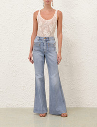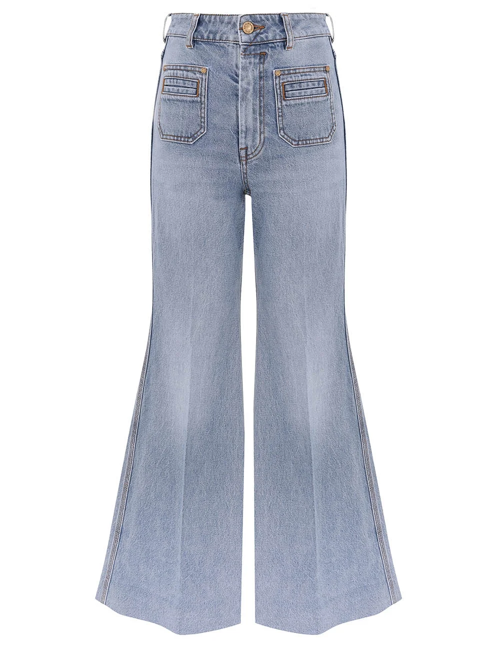 ITEM DETAILS The Denim Flare Jean in Sea Foam from our Spring 2026 Collection, Kindred Spirit. A denim jean featuring a high-rise waistband with belt loops, single button closure, pockets throughout, finished with a wide flare hem. - Denim cotton fabric - High-rise, full-length pant - Centre front fly closure - Decorative front pockets - Back welt pockets - Wide hem - Topstitching only Style Code: 7486PS26R SIZE DETAILS 24 25 26 27 28 29 30 31 32 Length 44 44.5 44.5 44.5 45 45 Waist 24.5 25 26 27.5 28.5 29 Hip 34 35.5 36 37 38 39.5 Inseam 34 34 34 34 34 34 Fitted at the waist and hips, relaxed through the legs High-rise waist with a full-length leg This garment fits true to size Available in size 0P, suited to clients who are under 5'3"/ 160cm Model is 5'9.5"/178 cm, bust size 32C/10C and wears a size 0 Item measurements are in inches CARE INSTRUCTIONS Main: 99% cotton, 1% elastane; pocketing: 86% polyester, 14% cotton Gentle cold machine wash separately with mild detergent; Remove any detachable trims prior to cleaning Cover to protect trim; Do not soak or bleach; Do not tumble dry; Dry in shade without delay; Iron in low temperature with protective cloth; Do not spot clean; Dry cleanable code p Always check the label or care card for specific care instructions.