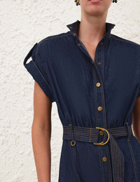 ITEM DETAILS The Denim Midi Dress in Harbour Blue from our Spring 2026 Collection, Kindred Spirit. A denim midi dress featuring a high stand collar, wide sleeves with bar tabs, centre front buttons, finished with a D-ring waist belt and pleated frill skirt. - Denim cotton fabric - Short-sleeve, mid-length dress - Angled wide sleeves with rolled cuffs - Bar tabs with gold button detailing - Centre front button closure - D-ring waist belt - Topstitching throughout Style Code: 7479DS26R SIZE DETAILS 0P 0 1 2 3 4 Length 45.5 49.5 50 50 50.5 50.5 Bust 41 43.5 45 47 49 51 Waist 25 27 28.5 29 32.5 34.5 Hip 35.5 38 39.5 41.5 44 45.5 Slightly fitted at the bust and waist Relaxed through the skirt This garment fits true to size Available in size 0P, suited to clients who are under 5'3"/ 160cm Model is 5'9.5"/178 cm, bust size 32C/10C and wears a size 0 Item measurements are in inches CARE INSTRUCTIONS Main and belt: 100% cotton; lining: 65% polyester, 35% cotton Gentle cold machine wash separately with mild detergent; Remove any detachable trims prior to cleaning Cover to protect trim; Do not soak or bleach; Do not tumble dry; Dry in shade without delay; Iron in low temperature with protective cloth; Do not spot clean; Dry cleanable code p Always check the label or care card for specific care instructions.