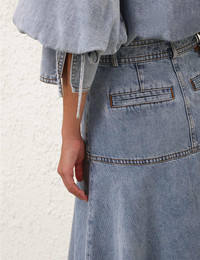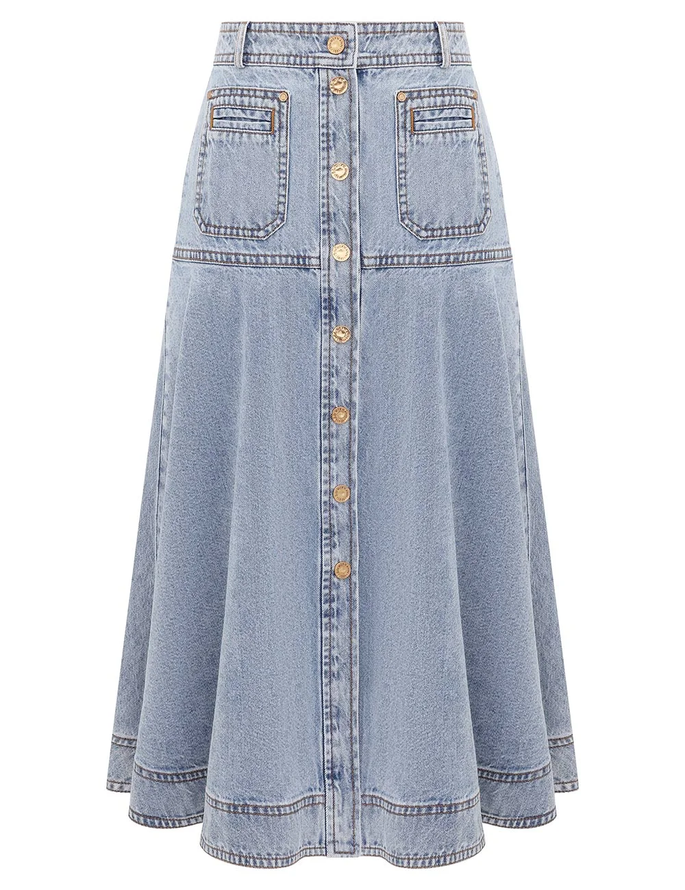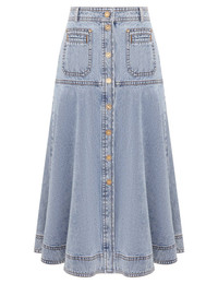 ITEM DETAILS The Denim Midi Skirt in Sea Foam from our Spring 2026 Collection, Kindred Spirit. A denim skirt featuring a fixed mid-rise waistband with belt loops, centre front gold button detailing pockets, finished with topstitching throughout and a flared hem. - Denim cotton fabric - High-rise, mid-length skirt - Front patch pockets - Back welt pockets Style Code: 7485SS26R SIZE DETAILS 0P 0 1 2 3 4 Length 29 32 32 32 32 32 Waist 25 27 28.5 30.5 33 34.5 Hip 35.5 37 39.5 41.5 43.5 45.5 Fitted at the waist, relaxed through the skirt Heavy-weight, rigid denim This garment fits true to size Available in size 0P, suited to clients who are under 5'3"/ 160cm Model is 5'9.5"/178 cm, bust size 32C/10C and wears a size 0 Item measurements are in inches CARE INSTRUCTIONS Main: 100% cotton; pocketing: 86% polyester, 14% cotton Gentle cold machine wash separately with mild detergent; Remove any detachable trims prior to cleaning Cover to protect trim; Do not soak or bleach; Do not tumble dry; Dry in shade without delay; Iron in low temperature with protective cloth; Do not spot clean; Dry cleanable code p Always check the label or care card for specific care instructions.
