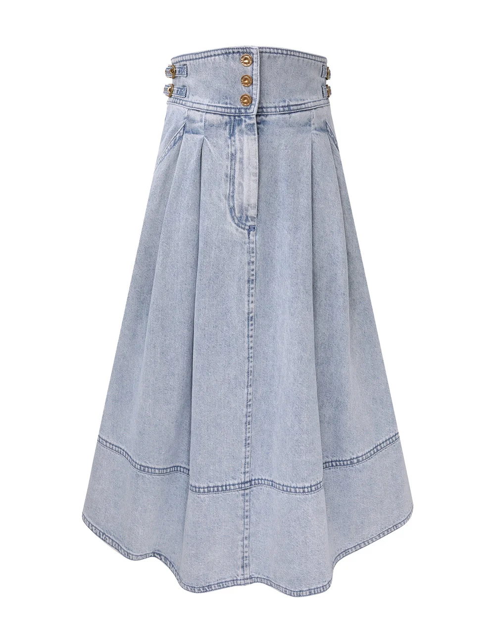 ITEM DETAILS The Denim Midi Skirt in Castaway from our Cruise 2026 Collection, Twisted Romance. A denim midi-length skirt featuring a fixed waistband with bar tacks, gold button detailing, finished with functional side pockets. - Denim skirt - High waistband with buckle tabs - Centre front metal fly closure - Topstitching throughout - Functional side pockets Style Code: 6382SC26R SIZE DETAILS 0P 0 1 2 3 4 Length 37 30.5 30.5 30.5 30.5 30.5 Waist 26 27 29 31.5 33 35.5 Hip 37 39.5 41.5 44 45.5 48 Fitted at the waist, relaxed throughout Heavy-weight, non-stretchy fabric This garment fits true to size Available in size 0P, suited to clients who are under 5'3"/ 160cm Model is 5'9.5"/178 cm, bust size 32C/10C and wears a size 0 Item measurements are in inches CARE INSTRUCTIONS Main: 100% cotton; pocketing: 86% polyester, 14% cotton Gentle cold machine wash separately with mild detergent; Remove any detachable trims prior to cleaning Cover to protect trim; Do not soak or bleach; Do not tumble dry; Dry in shade without delay; Iron in low temperature with protective cloth; Do not spot clean; Dry cleanable code p Always check the label or care card for specific care instructions.