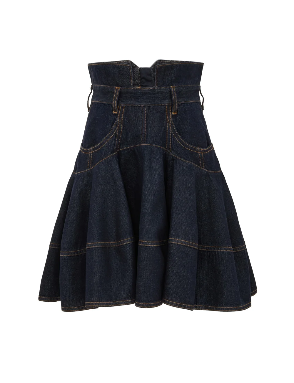 ITEM DETAILS The Denim Mini Skirt in Night Sky from our Fall 2025 Collection, Hypnotic. A denim mini skirt featuring an exaggerated high waist with keyhole cutout, belt loops, front pockets and a flared hem. - Denim mini skirt - Gold centre back zip closure - Belt loops along fixed waistband with keyhole detail - Front pockets at both sides of skirt - Flared hem Style Code: 4733SF25R SIZE DETAILS 0P 0 1 2 3 4 Length 45 48 48 49 50 51 Waist 66 68 74 80 84 88 Hip 96 100 104 110 114 120 Designed to be fitted at the waist, loose below the hip This garment fits true to size Available in size 0P, suited to clients who are under 5'3"/ 160cm Model is 5'9.5"/178 cm, bust size 32C/10C and wears a size 0 Item measurements have been rounded to the nearest cm CARE INSTRUCTIONS Main : 75% cotton 25% viscose lining : 86% polyester 14% cotton Gentle cold machine wash separately with mild detergent; Remove any detachable trims prior to cleaning Cover to protect trim; Do not soak or bleach; Do not tumble dry; Dry in shade without delay; Cool iron with protective cloth; Do not spot clean; Dry cleanable code p Always check the label or care card for specific care instructions.