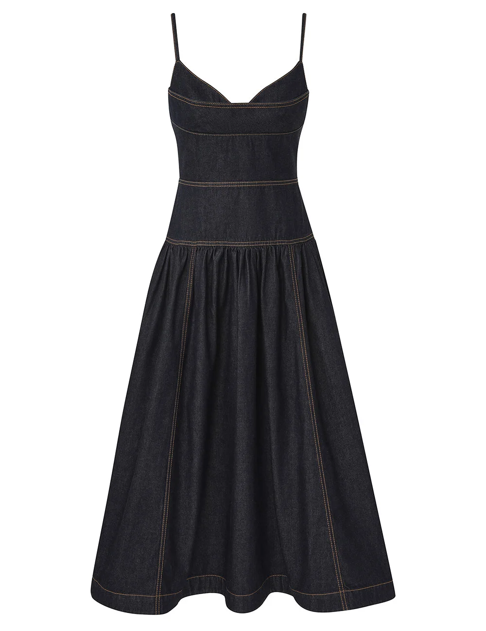 ITEM DETAILS The Denim Sleeveless Midi Dress in Night Sky from our Cruise 2026 Collection, Twisted Romance. A denim midi dress featuring an elongated fitted bodice with a V-neckline with an overlay bust detailing, finished with adjustable straps. - Denim midi dress - Adjustable straps - Fitted bodice with panelling - Shirring at back bodice - Metal zip closure at centre back - Gathered skirt - Side seam pockets Style Code: 6963DC26R SIZE DETAILS 0P 0 1 2 3 4 Length 33 38.5 38.5 38.5 38.5 38.5 Waist 25 27 28.5 30.5 32.5 34.5 Hip 33 35.5 37 39.5 41 43.5 Fitted bodice, relaxed through the legs Heavy-weight, non-stretchy fabric This garment fits true to size Available in size 0P, suited to clients who are under 5'3"/ 160cm Model is 5'9.5"/178 cm, bust size 32C/10C and wears a size 0 Item measurements are in inches CARE INSTRUCTIONS Main: 100% cotton; bodice lining: 100% cotton; lining: 86% polyester, 14% cotton; pocketing: 86% polyester, 14% cotton Gentle cold machine wash separately with mild detergent; Remove any detachable trims prior to cleaning Cover to protect trim; Do not soak or bleach; Do not tumble dry; Dry in shade without delay; Iron in low temperature with protective cloth; Do not spot clean; Dry cleanable code p Always check the label or care card for specific care instructions.