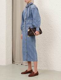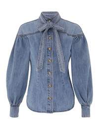 ITEM DETAILS The Denim Tie Neck Blouse in Dawn Blue from our Fall 2025 Collection, Hypnotic. A denim blouse featuring a stand collar, pussybow necktie, billow sleeves gathered into fitted cuffs, and gold button detailing throughout. - 100% cotton denim - Self-tie stand collar necktie - Long sleeves gathered into fitted cuffs - Centre front placket with functional gold buttons Style Code: 5010TF25R SIZE DETAILS 0P 0 1 2 3 4 Length 56 60 61 62 62 63 Bust 88 94 98 102 108 112 Waist 72 76 82 86 92 96 Sleeve 44 47 47 47 47 47 Designed to be slightly fitted at the bust and waist This garment fits true to size Available in size 0P, suited to clients who are under 5'3"/ 160cm Model is 5'9.5"/178 cm, bust size 32C/10C and wears a size 0 Item measurements have been rounded to the nearest cm CARE INSTRUCTIONS 100% cotton Gentle cold machine wash separately with mild detergent; Remove any detachable trims prior to cleaning Cover to protect trim; Do not soak or bleach; Do not tumble dry; Dry in shade without delay; Cool iron with protective cloth; Do not spot clean; Dry cleanable code p Always check the label or care card for specific care instructions.