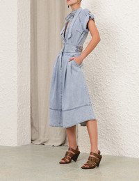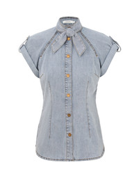 ITEM DETAILS The Denim Tie Neck Shirt in Castaway from our Cruise 2026 Collection, Twisted Romance. A denim shirt featuring a stand collar with a removable necktie, short sleeves with folded cuffs and buttons down the centre front. - Denim slim fit shirt - Rolled cuffs with bar tacks - Detachable necktie - Gold buttons down the centre front - Topstitching throughout Style Code: 7247TC26R SIZE DETAILS 0P 0 1 2 3 4 Length 22.5 24 24.5 24.5 25 25 Bust 33 34.5 37 38.5 41 43.5 Waist 27 28.5 30.5 32.5 34.5 36 Sleeve 10.5 11 11.5 12 12 12.5 Slim fit Heavy-weight, non-stretchy fabric This garment fits true to size Available in size 0P, suited to clients who are under 5'3"/ 160cm Model is 5'9.5"/178 cm, bust size 32C/10C and wears a size 0 Item measurements are in inches CARE INSTRUCTIONS 100% cotton Gentle cold machine wash separately with mild detergent; Remove any detachable trims prior to cleaning Cover to protect trim; Do not soak or bleach; Do not tumble dry; Dry in shade without delay; Iron in low temperature with protective cloth; Do not spot clean; Dry cleanable code p Always check the label or care card for specific care instructions.