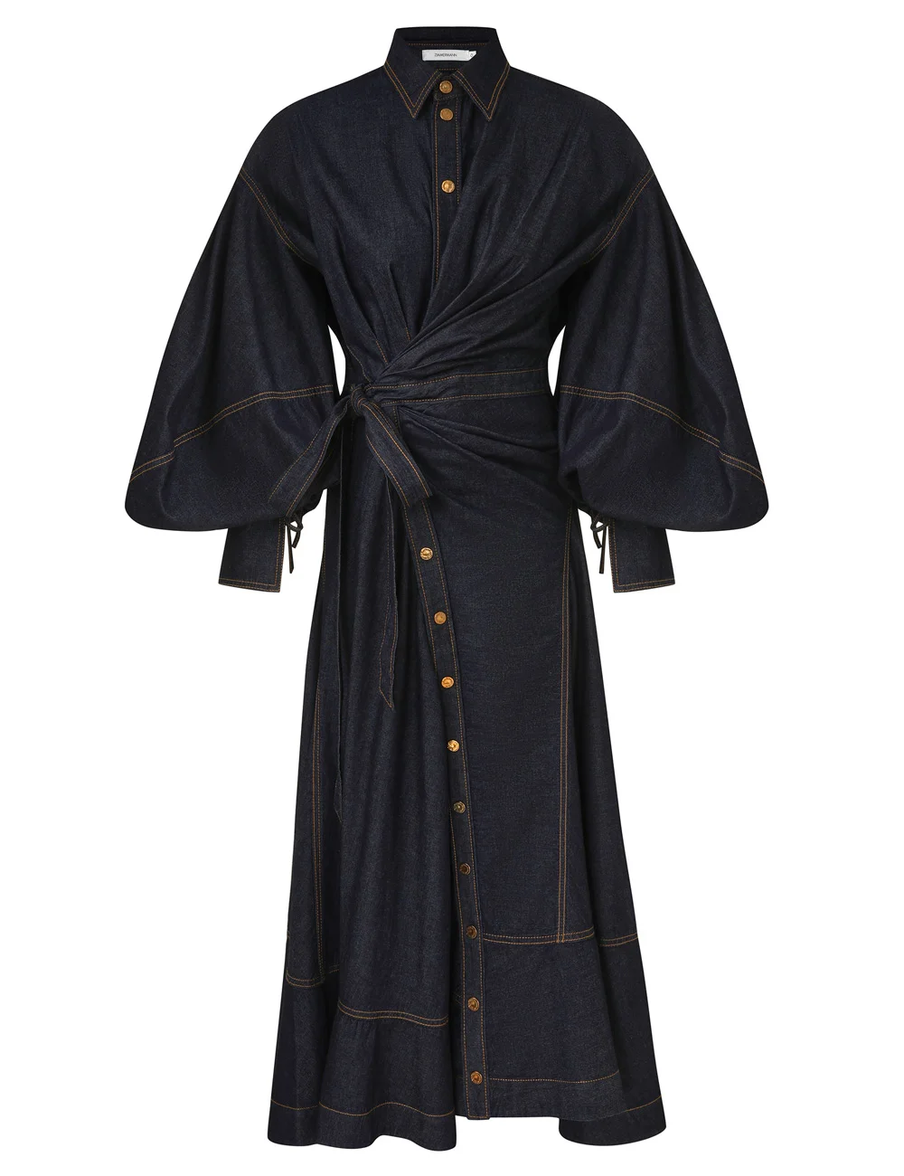 ITEM DETAILS The Denim Wrap Maxi Dress in Night Sky from our Cruise 2026 Collection, Twisted Romance. A denim maxi dress featuring a classic collar, snap buttons down the centre front, long billow sleeves with fitted cuffs, finished with a wrap waist belt tied to one side. - Denim maxi dress - Topstitching throughout - Self-tie wrap belt at right hand side - Rouleau ties at fitted cuffs - Heavily gathered Style Code: 6770DC26R SIZE DETAILS 0P 0 1 2 3 4 Length 50.5 55.5 55.5 56 56.5 56.5 Sleeve 22.5 23.5 23.5 23.5 23.5 23.5 Wrap style bodice for an adjustable fit, relaxed through the skirt Heavy-weight, non-stretchy fabric This garment fits true to size Available in size 0P, suited to clients who are under 5'3"/ 160cm Model is 5'9.5"/178 cm, bust size 32C/10C and wears a size 0 Item measurements are in inches CARE INSTRUCTIONS Main: 100% cotton; lining: 86% polyester, 14% cotton Gentle cold machine wash separately with mild detergent; Remove any detachable trims prior to cleaning Cover to protect trim; Do not soak or bleach; Do not tumble dry; Dry in shade without delay; Iron in low temperature with protective cloth; Do not spot clean; Dry cleanable code p Always check the label or care card for specific care instructions.