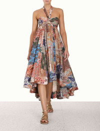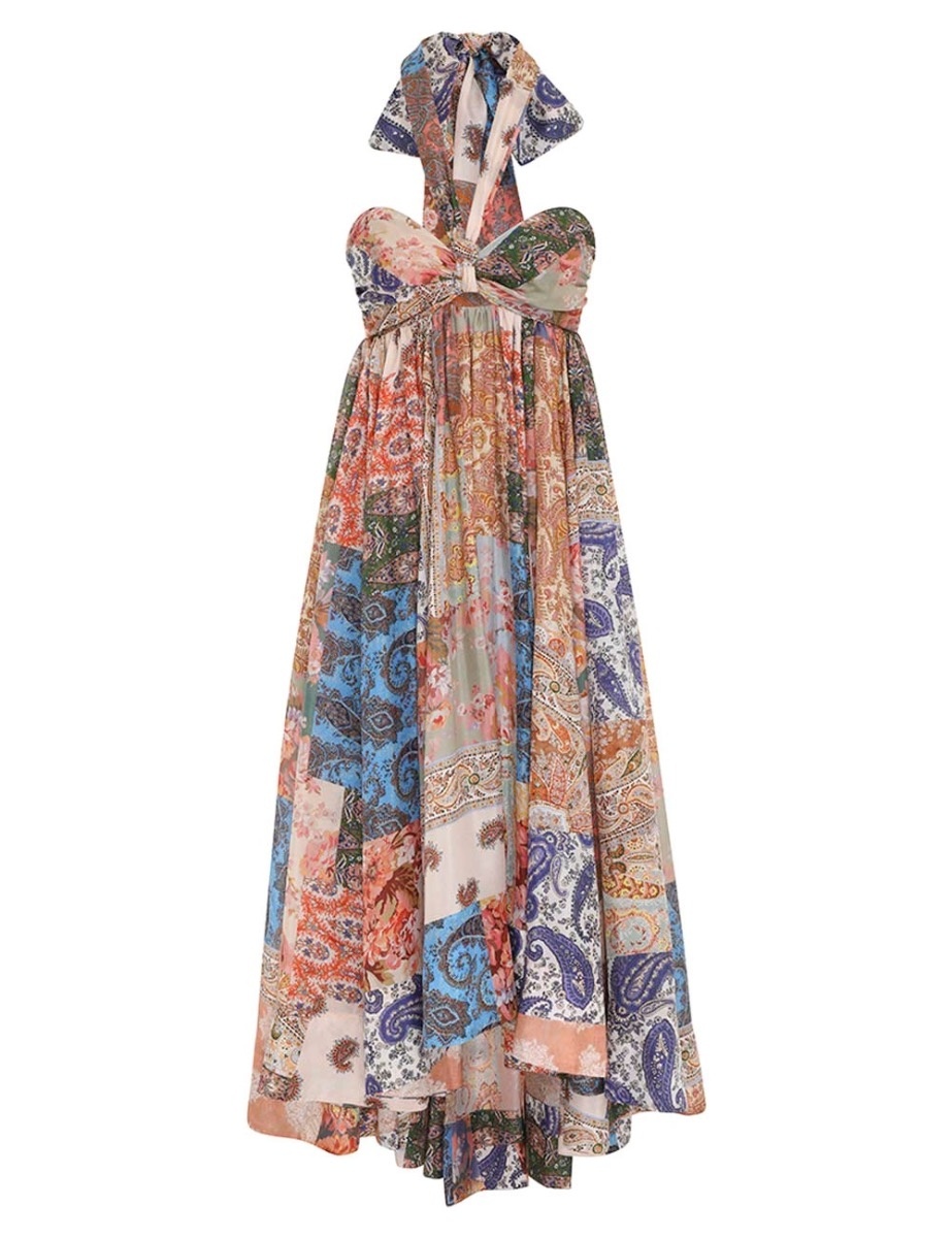 ITEM DETAILS The Devi Halter Maxi Dress in Patch Paisley from our Summer Swim 2023 Collection. A silk maxi dress featuring an asymmetric hem and a sweetheart neckline with a self tie halter neck. - Silk dress - Boning through bodice - Side seam pockets - Shirred back panel - Invisible zip closure Style Code: 7114DSS231 SIZE DETAILS 0P 0 1 2 3 4 Length 104 104 114 114 114 114 Bust 66 72 76 82 88 92 Shirred at back of bust, relaxed through waist and skirt. This garment fits true to size, we recommend you select your normal size. Available in size 0P, specially designed with petite proportions that are suited to clients who are under 5'3"/ 160cm. Our model is 5'9.5" / 178 cm, bust size 32C/10C and is wearing a size 0. Item measurements have been rounded to the nearest cm. CARE INSTRUCTIONS 100% silk Exclusive of trims Dry clean only code p Cool iron Do not spot clean Always refer to the garment care label for specific care instructions.