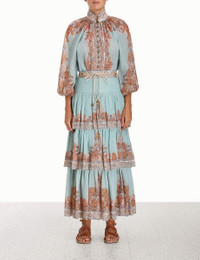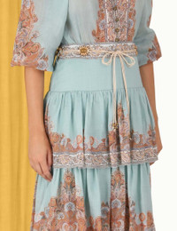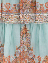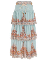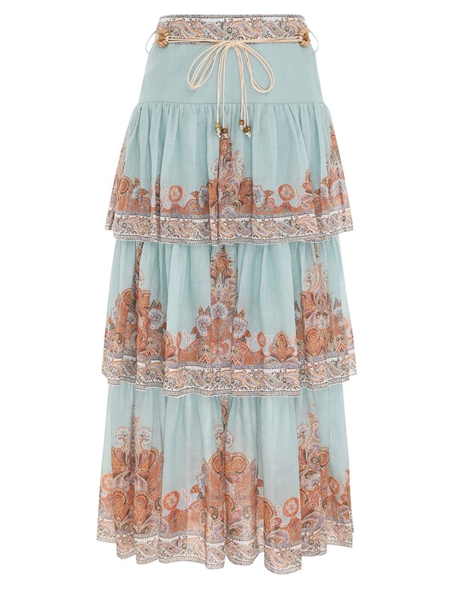 ITEM DETAILS The Devi Tiered Skirt in Mint Paisley from our Summer Swim 2023 Collection. A ramie midi skirt featuring a drop waist and frilled tiers with picot edging throughout. - Ramie skirt - Placement print throughout - Tiers with picot frill edges - Invisible zip at centre back - Removable belt Style Code: 7097SSS231 SIZE DETAILS 0P 0 1 2 3 4 Length 89 89 98 98 98 98 Waist 64 68 72 78 82 88 Hip 88 92 98 102 108 112 Fitted through waist and hips. Relaxed through skirt. This garment fits true to size, we recommend you select your normal size. Available in size 0P, specially designed with petite proportions that are suited to clients who are under 5'3"/ 160cm. Our model is 5'9.5" / 178 cm, bust size 32C/10C and is wearing a size 0. Item measurements have been rounded to the nearest cm. CARE INSTRUCTIONS Main: 100% ramie Lining: 100% cotton Exclusive of trims Remove belt before laundering Dry clean only code p Cool iron Do not spot clean Always refer to the garment care label for specific care instructions.