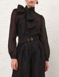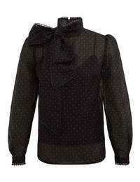 ITEM DETAILS The Dream Pussybow Blouse in Black Dot from our Fall 2025 Collection, Hypnotic. A silk linen blend blouse featuring a stand collar with pussybow necktie and an invisible zip at centre back. - Silk linen blouse - Fixed pussybow necktie - Long billow sleeves - Single button closure at sleeve cuffs - Scalloped lace trim at the collar and cuffs - Invisible zip closure at centre back - Comes with a separate slip Style Code: 5234TF253 SIZE DETAILS 0P 0 1 2 3 4 Length 22.5 24.5 24.5 25 25 25 Bust 34.5 36 38.5 41 42.5 45 Waist 35.5 38 39.5 41.5 43.5 45.5 Sleeve 26.5 24 24 24.5 25 25 Slightly loose through the body, with a closer fit at the bust and shoulders This garment fits true to size Available in size 0P, suited to clients who are under 5'3"/ 160cm Model is 5'9.5"/178 cm, bust size 32C/10C and wears a size 0 Item measurements are in inches CARE INSTRUCTIONS Main: 53% linen, 47% silk; trim: 100% polyamide; slip: 100% viscose Dry clean only code f (hydrocarbon only); Remove any detachable trims prior to dry cleaning; Cover to protect trim; Cool iron with protective cloth; Light steam only; Do not spot clean Dry clean only code f (hydrocarbon only); Remove any detachable trims prior to dry cleaning; Cover to protect trim; Do not steam; Cool iron with protective cloth; Do not spot clean Always check the label or care card for specific care instructions.
