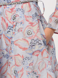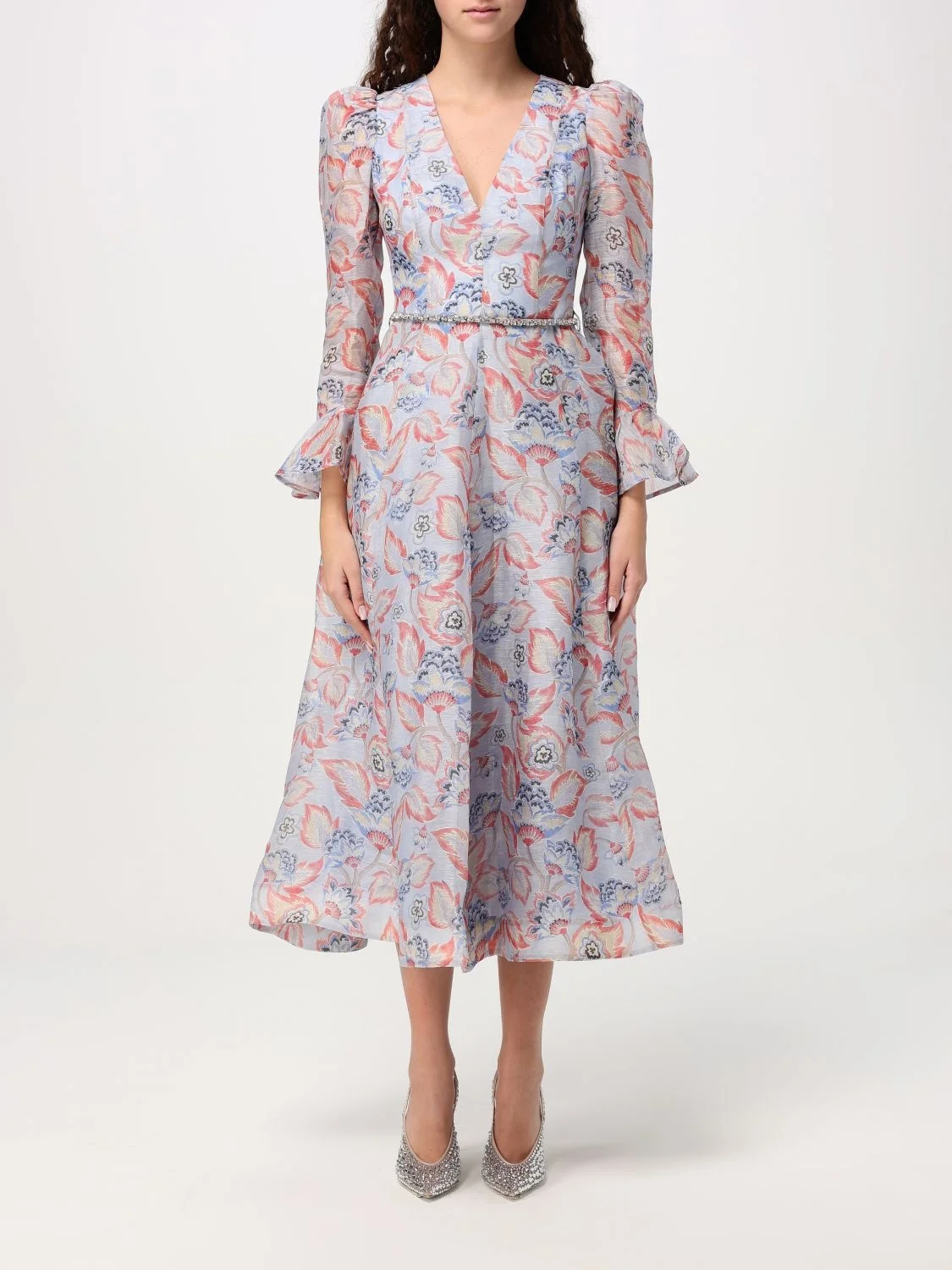DESCRIPTION - Neckline: V neckline - Shoulders: Curled, Puff - Sleeves: Long - Closure: Back closure with zip - Waist: With jewel belt - Shape: Flared - Length: Midi dresses - Occasion: Ceremony and cocktail dresses, Evening and party dresses - Materials: Linen - Pattern: Floral DETAILS AND CARE Composition 53% Linen 47% Silk SIZE AND FIT Sizes not available Size and fit Regular fit Designer code: 4694DF242 SAPEDE Giglio Code: G17925 Designer: Zimmermann Collection: Zimmermann Woman Category: Clothing Zimmermann