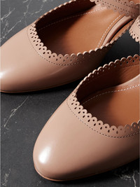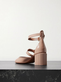 Zimmermann's 'Eddie' pumps are designed with so many unique elements, like laser-cut scalloped trims and a ribbed block heel inspired by architectural columns. Made from smooth leather, they have rounded toes and buckled Mary Jane straps. Details & Care - Heel measures approximately 55mm/ 2 inches - Tan leather (Calf) - Buckle-fastening straps - Designer color: Biscuit