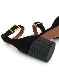 ITEM DETAILS The Eddie Mary Jane 55 in Black from our Cruise 2026 Collection, Twisted Romance. Eddie is the perfect day to occasion shoe, with its bespoke sculptural heel taking inspiration from architectural columns, laser-cut scallop detailing, and gold hardware. - Suede fabric Mary Jane - Scalloped edges - Round toe - Adjustable ankle and upper strap - 55mm column heel - Made in Italy Style Code: 6324FC26A1 SIZE DETAILS This shoe fits true to size. CARE INSTRUCTIONS Upper: goat suede; lining: sheep leather; outsole: calf leather Suede care Handcrafted from genuine suede, this item may discolor or stain if exposed to humidity or atmospheric conditions Use a soft-bristled brush to remove soil and a stain repellent Avoid contact with light, heat, water, oils, perfume, and cosmetics Store in a dry environment in the original dust bag Always check the label or care card for specific care instructions.