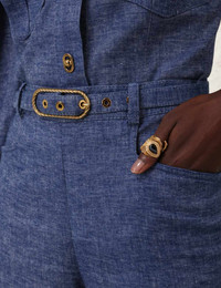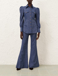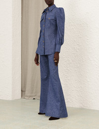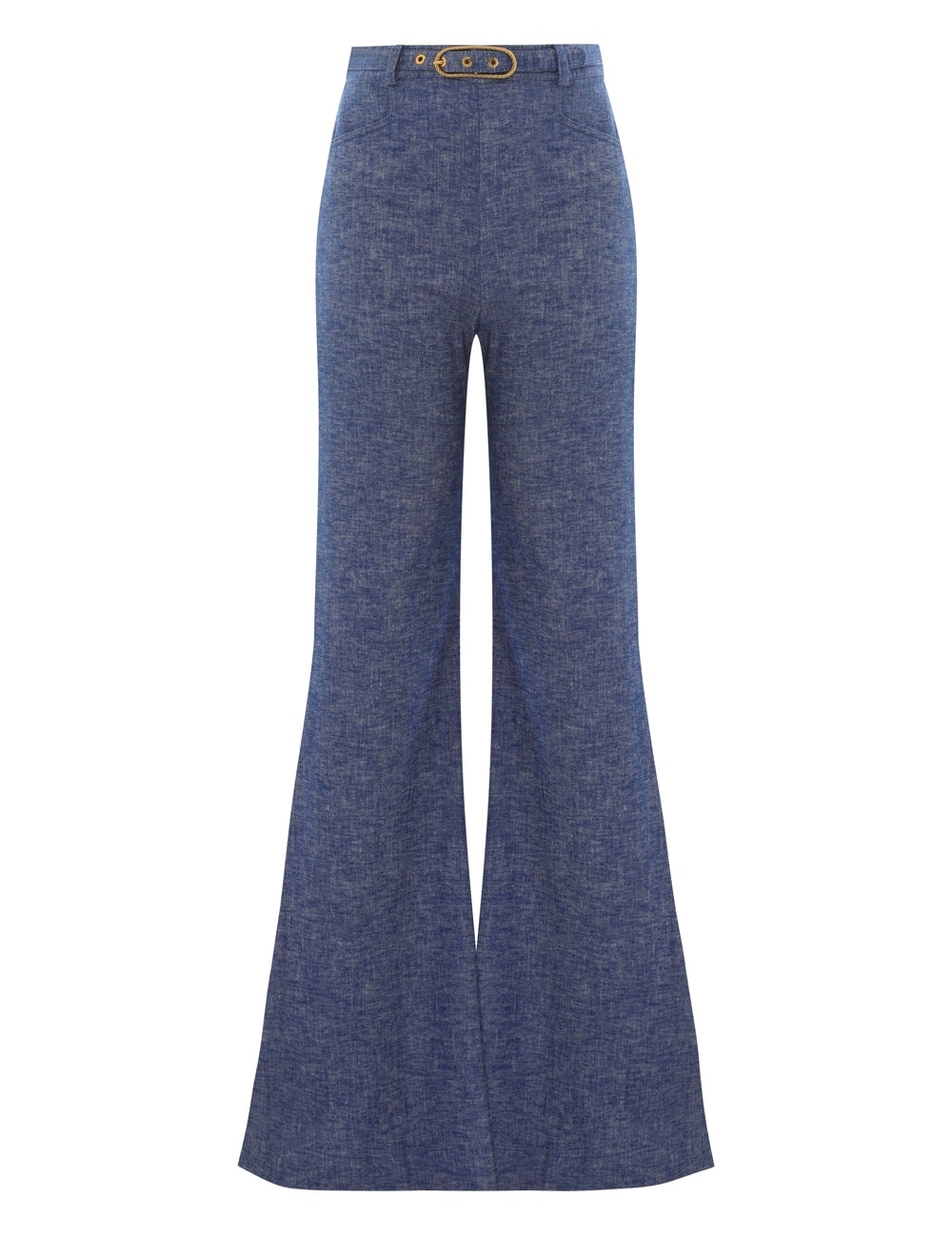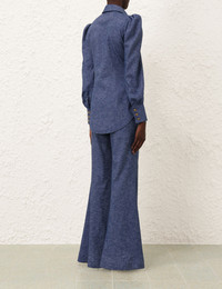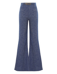 ITEM DETAILS The Eden Chambray Flare Pant in Chambray from our Fall 2024 Collection, In Illustration. A linen flared leg pant featuring front pockets, a self cover buckle belt and a centre back zip. - Flared full-length pant - Centre back zip closure - High waisted - French seams - Removable buckle belt Style Code: 0375PF242 SIZE DETAILS 0P 0 1 2 3 Length 40 44 44.5 44.5 45 Waist 25.5 27 28.5 30.5 32.5 Hip 33.5 34.5 37 39 41 Fixed high waist Relaxed through legs This garment fits true to size Available in size 0P, suited to clients who are under 5'3"/ 160cm Model is 5'9.5"/178 cm, bust size 32C/10C and wears a size 0 Item measurements are in inches. CARE INSTRUCTIONS Main: 51% linen, 47% cotton, 2% spandex Pocketing: 75% viscose, 25% silk Dry clean code f (hydrocarbon only), inside out in a protective bag Remove detachable trims and accessories prior to cleaning Cover to protect hardware Cool iron with protective cloth Do not spot clean Always check the garment care label for specific care instructions.